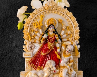 Bring spirituelle Harmonie in dein Zuhause! Diese wunderschön handgefertigte Göttin Durga Statue von Gangesindia ist ein echtes Kunstwerk. Aus hochwertigem Kaltguss-Kunstharz mit Bronze-Finish gefertigt, sitzt die Göttin anmutig auf einem Lotus. Mit 8,9 x 7,1 x 3,8cm ist sie perfekt für deinen Hausaltar, Pooja-Raum oder als Tischdekoration. Laut Vastu bringt Durga Mut und positive Energie - ideal für Meditation und Gebete. Die Figur kommt in einer schönen Geschenkbox und ist ein bedeutungsvolles Geschenk für Diwali, Hochzeiten oder andere besondere Anlässe. Ob für dich selbst oder als Präsent für spirituelle Freunde - diese Durga Statue verbreitet eine besondere Atmosphäre der Hingabe und inneren Stärke.