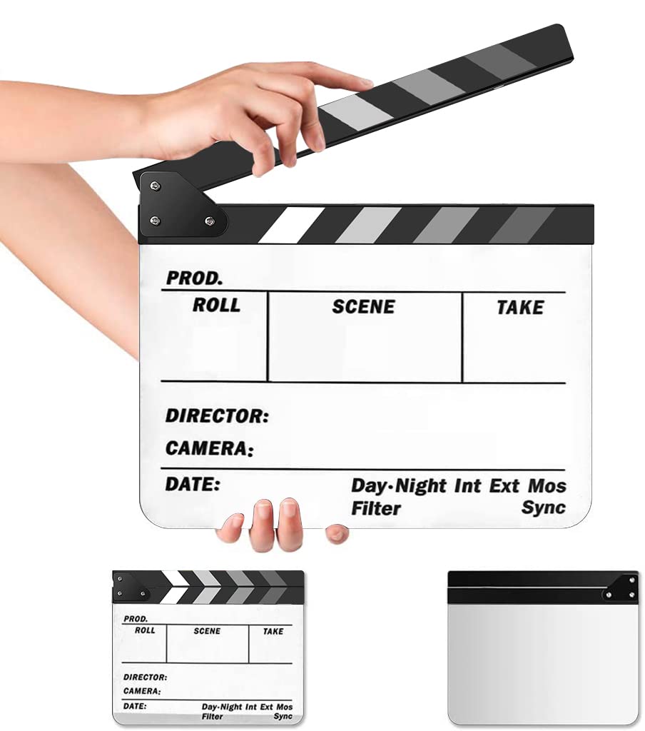 Licht, Kamera, Action! Mit dieser professionellen Filmklappe fühlst du dich wie ein echter Regisseur. Die 26,5x30cm große Acrylklappe ist flach und kratzfest, beschreibbar mit den beiliegenden Stiften. Inklusive magnetischem Radiergummi und Reinigungstuch - einfach beschriften, klappen und wieder löschen. Perfekt für Filmprojekte, Werbespots, YouTube-Videos oder Fotoshootings. Aber auch als coole Deko fürs Home-Office, Studio oder für Hollywood-Partys ein absoluter Hingucker. Die klare Beschriftung ist selbst bei schlechtem Licht gut lesbar. Mach deine Produktionen professioneller oder verschenke ein besonderes Geschenk an Filmbegeisterte. Mit diesem Set bist du der Director deines eigenen Films!