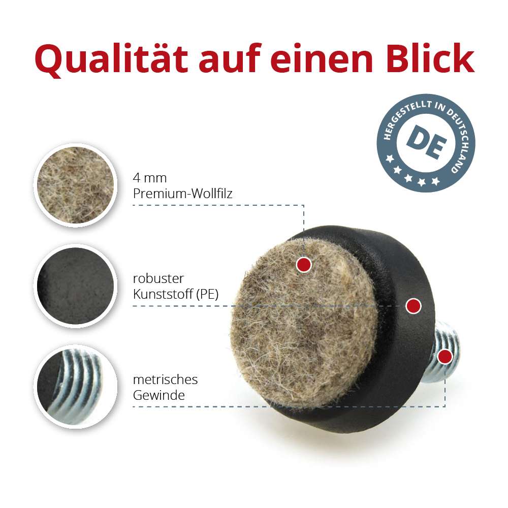 Deine Möbel wackeln wegen unebenen Böden? Diese praktischen Bodenausgleichsschrauben lösen das Problem im Handumdrehen! Im 2er-Set geliefert, mit M8 Gewinde und 20mm Länge - perfekt für die meisten Möbel. Der Clou: Die dicken Filzauflagen (mindestens 3mm) schützen deine Böden vor Kratzern und dämpfen zusätzlich. Einfach in die vorhandenen Gewinde drehen - und schon steht dein Schrank, Tisch oder Regal bombenfest! Aus verzinktem Stahl - also rostfrei und super stabil. Der Fußdurchmesser von 24mm gibt genug Standfläche, und die 8mm Höhe reichen meist völlig aus. Made in Germany - Qualität, die man kennt und vertraut. Ob Parkett, Laminat oder Fliesen - mit den Filzfüßen machst du nichts kaputt. Einfach mal ausprobieren - du wirst überrascht sein, wie viel ruhiger deine Möbel plötzlich dastehen! Kein lästiges Wackeln mehr, keine Sorgen um deine Böden. Ein wirklich sinnvolles Upgrade für jedes Zuhause!