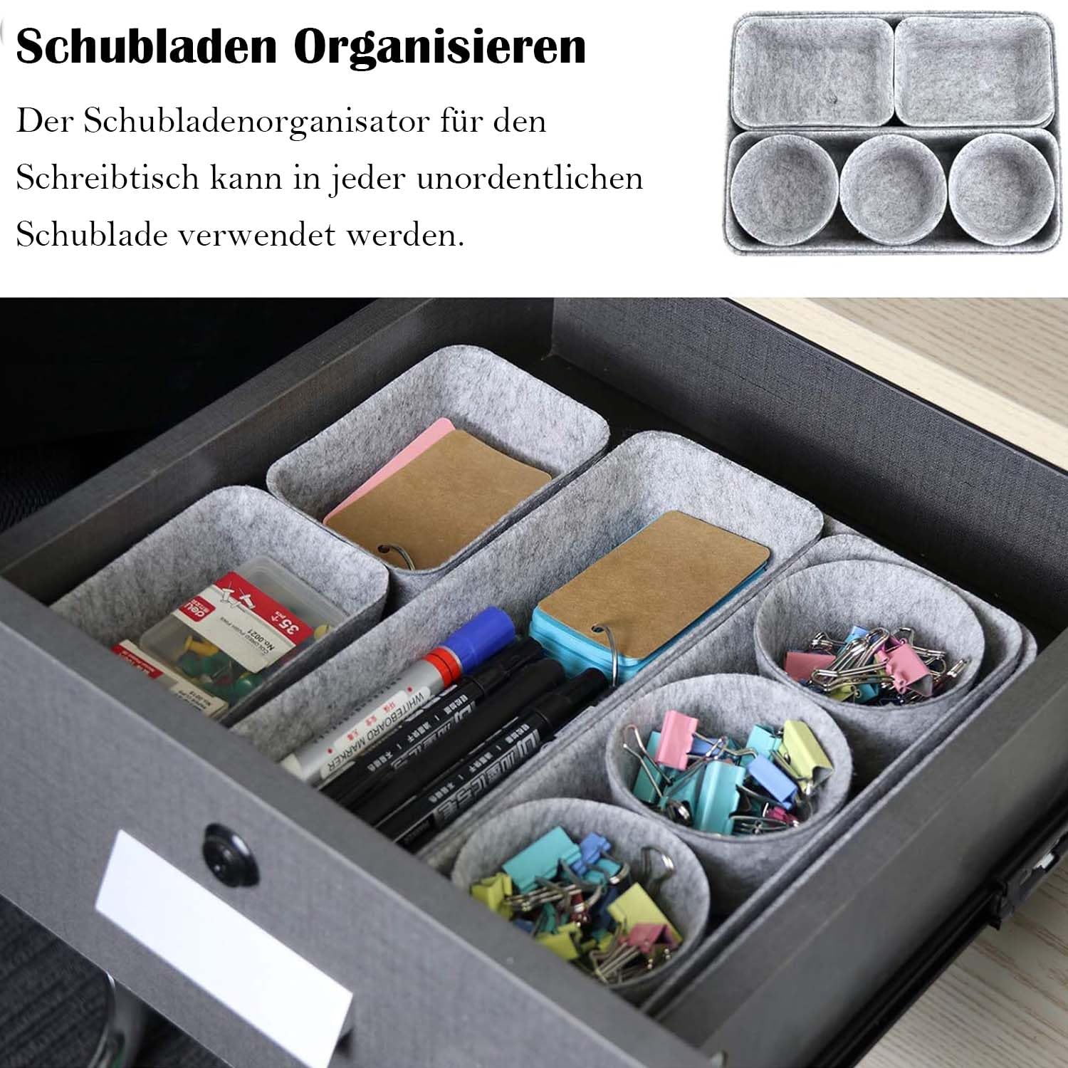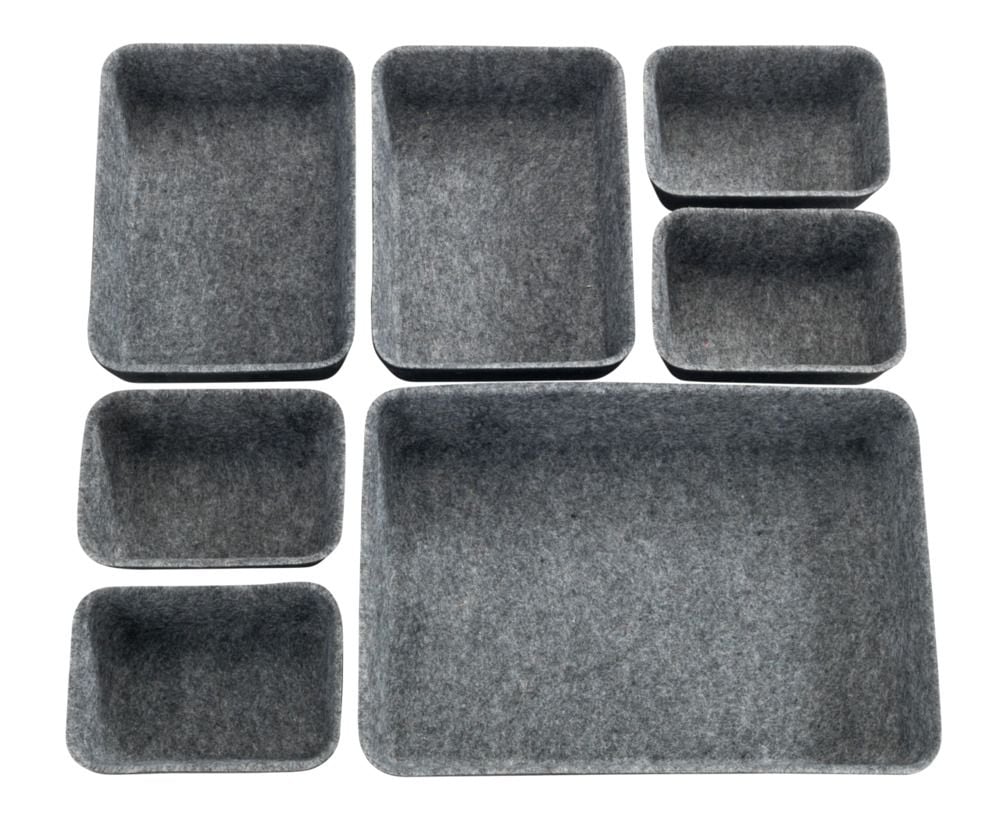 Schluss mit dem Chaos in deinen Schubladen! Dieses 7-teilige Set aus weichem Filz bringt sofort Ordnung in dein Leben. Enthalten sind: 4 kleine Boxen (13,5x9,3x5cm), 2 mittlere (19,2x14x5cm) und 1 große (28,5x20x5cm). Perfekt für Socken, Unterwäsche, Schmuck, Kosmetik - alles findet seinen Platz! Die Boxen sind stapelbar und beliebig kombinierbar. Aus verdicktem Filz, viel langlebiger als Plastik. Super für Kommoden, Schreibtische, Schminktische oder Kleiderschränke. Endlich siehst du auf einen Blick, was du hast! Einfach zusammenschieben und schon ist alles sortiert. Mach dein Zuhause gemütlich und ordentlich - ohne großen Aufwand. Deine Schubladen werden dich morgens nicht mehr erschrecken!