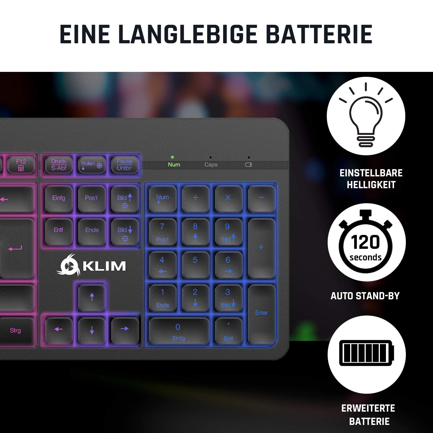 Zockst du gerne ohne Kabel-Wirrwarr? Dann ist die KLIM Light V2 genau das Richtige für dich! Diese kabellose Gaming-Tastatur ist so reaktionsschnell, dass du vergisst, dass sie überhaupt kabellos ist. Mit ihrer extrem niedrigen Reaktionszeit hält sie problemlos mit kabelgebundenen Tastaturen mit. Die coole Beleuchtung macht nicht nur was her, sondern ist auch praktisch - jede Taste leuchtet intensiv, perfekt für nächtliche Gaming-Sessions. Du kannst die Helligkeit natürlich anpassen oder die Beleuchtung ganz ausschalten, wenn dir danach ist. Die Membrantasten sind super leise und angenehm zu tippen - deine Mitbewohner werden's dir danken! Mit speziellen Funktionstasten regelst du ganz easy Lautstärke, trackst deine Musik oder rufst den Taschenrechner auf. Hergestellt aus robustem ABS-Kunststoff hält die Tastatur so einiges aus - auch mal einen Wasserspritzer oder versehentlichen Fall. Mit einer Lebenserwartung von 10 Millionen Anschlägen begleitet dich die KLIM Light V2 sicher viele Jahre. Einfach den USB-Empfänger einstecken und schon kannst du bis zu 10 Meter entfernt zocken. Als Bonus gibt's nach dem Kauf sogar ein eBook zum schnelleren Tippen dazu - was will man mehr?