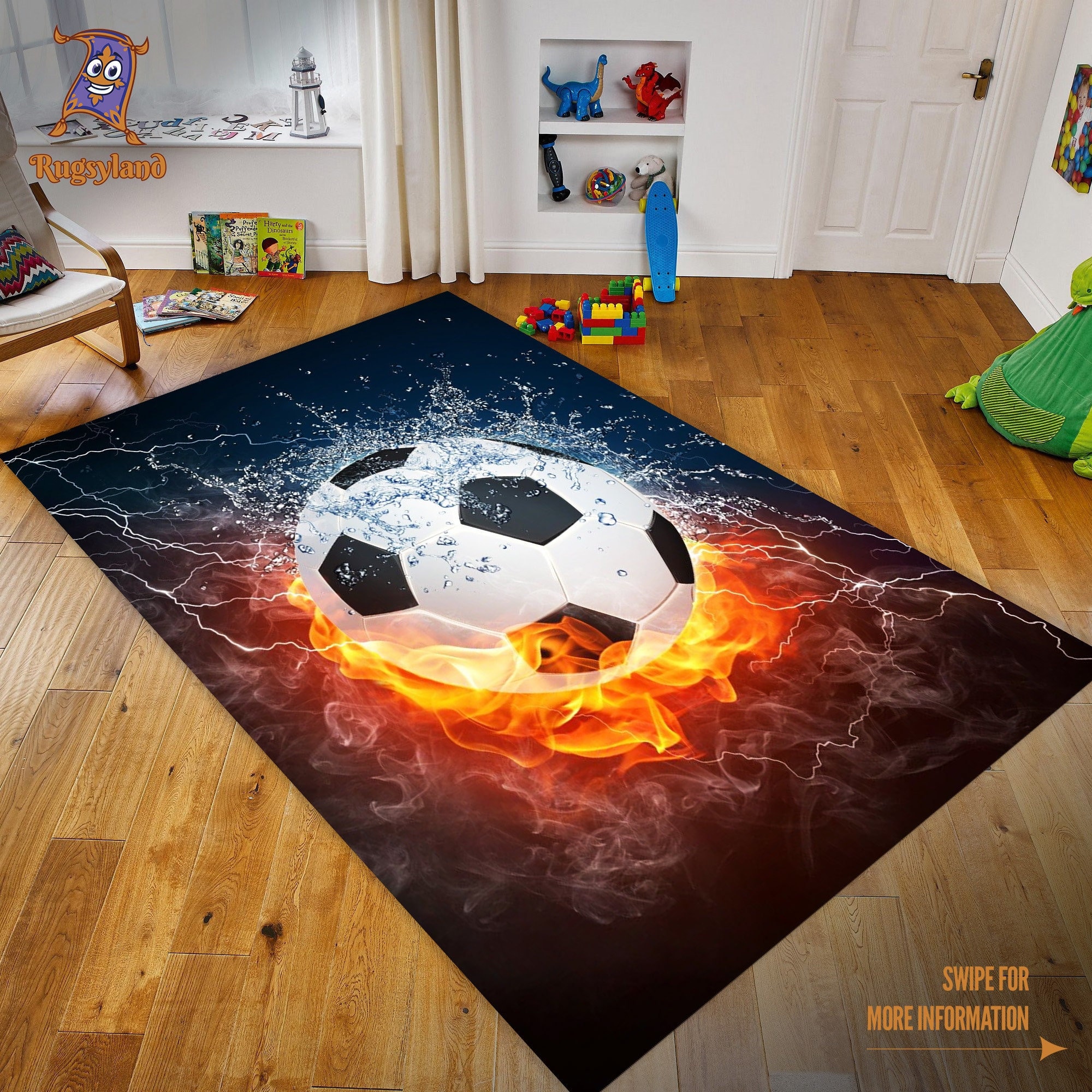Der coole Teppich für alle Fußball-Fans! Mit dynamischem Fußball-Design im 3D-Druck verwandelst du jedes Jugendzimmer in eine Sport-Arena. In großzügigen 140x200cm bietet der Teppich genug Platz zum Spielen, Chillen oder Zocken. Aus weichem Flanell mit Schwamm-Unterlage für extra Komfort - perfekt zum Draufsitzen oder Liegen. Die rutschfeste Unterseite mit Latex-Punkten sorgt für sicheren Halt auf jedem Boden. Besonders praktisch: Der Teppich ist leicht zu reinigen - einfach mildes Reinigungsmittel verwenden, schonend von Hand waschen und an der Luft trocknen. Ideal für kalte Böden im Winter oder als gemütliche Spielecke. Das lebendige Design in Blau mit Fußball-Motiv begeistert jeden jungen Fußball-Fan. Nicht nur dekorativ, sondern auch super praktisch für Gaming-Sessions, Playstation-Abende oder einfach zum Entspannen. Ein tolles Geschenk für Geburtstage, Weihnachten oder als Überraschung für deinen kleinen Fußball-Star!