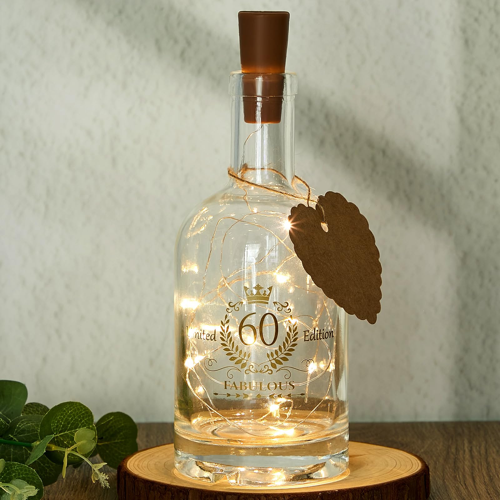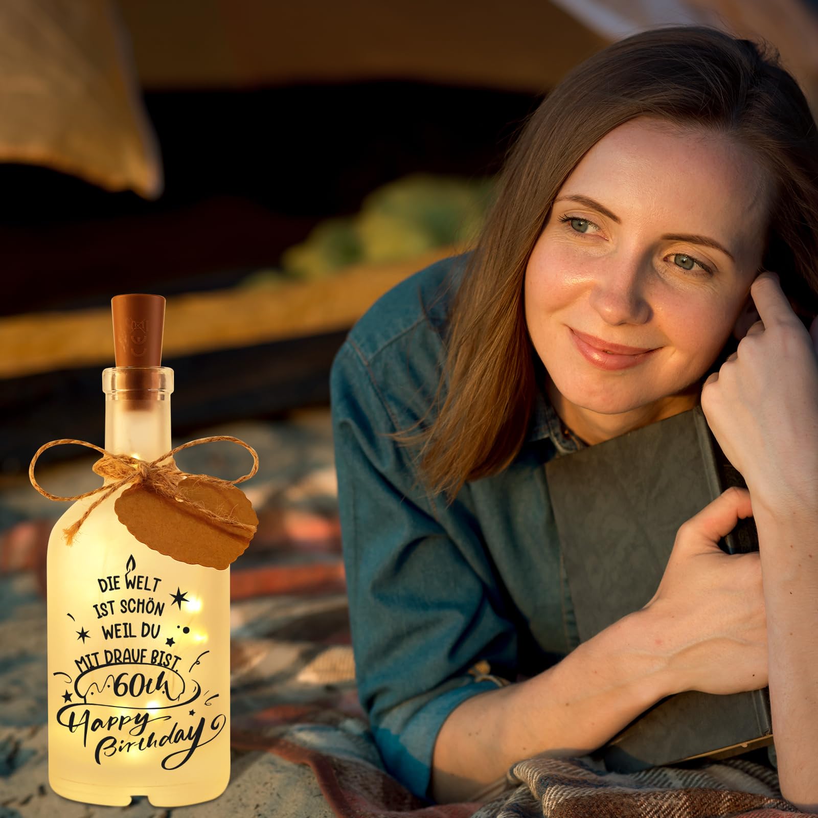 Das perfekte Geschenk zum 60. Geburtstag! Diese LED-Flasche mit dem Spruch 'HAPPY 60th BIRTHDAY, Die Welt Ist Schön Weil Du Mit Drauf Bist' ist einfach nur zauberhaft. Sobald du das Licht anschaltest, verbreitet sie ein wunderschön warmes Licht und schafft eine total gemütliche Atmosphäre. Komplett mit Glasflasche, LED-Verschluss, Leinenschnur und herzförmigem Anhänger - sogar die Batterien sind schon dabei. Super als Deko für Wohnzimmer, Regal oder Nachttisch. Eine richtig persönliche Aufmerksamkeit für Mama, Oma, Schwester oder beste Freundin. Macht den besonderen Tag noch unvergesslicher!