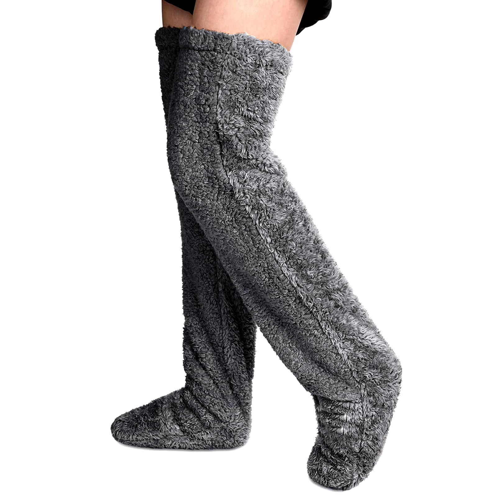 Boah, diese Overknee-Socken sind ja mega flauschig! Aus weichem Polyester - fühlen sich an wie auf Wolken! Perfekt für kalte Wintertage zu Hause - deine Beine bleiben schön warm! Das geniale Design: Öffnungen in der Fußsohle - du kannst sie als Socken mit offener Zehenpartie tragen oder ganz ohne Fuß! Super rutschfest - kein Ausrutschen auf glatten Böden! Maße: Sohlenlänge 23-25,5cm, Sockenbeinlänge 60cm, Gesamtlänge 90cm - passt für die meisten Größen! Der weite Bund (41,5-45cm Umfang) macht das An- und Ausziehen super einfach! Perfekt als Schlafsocken, Hausschuhe oder einfach zum gemütlichen Fernsehabend! Ob im Herbst oder im tiefsten Winter - damit frieren deine Beine garantiert nicht! Einfach über die Jeans oder Leggings ziehen oder direkt auf der Haut tragen! Weich, kuschelig und einfach nur bequem! Ein Must-Have für alle die es gemütlich mögen! Einfach bestellen und den Winter genießen - auch wenn's draußen stürmt und schneit!