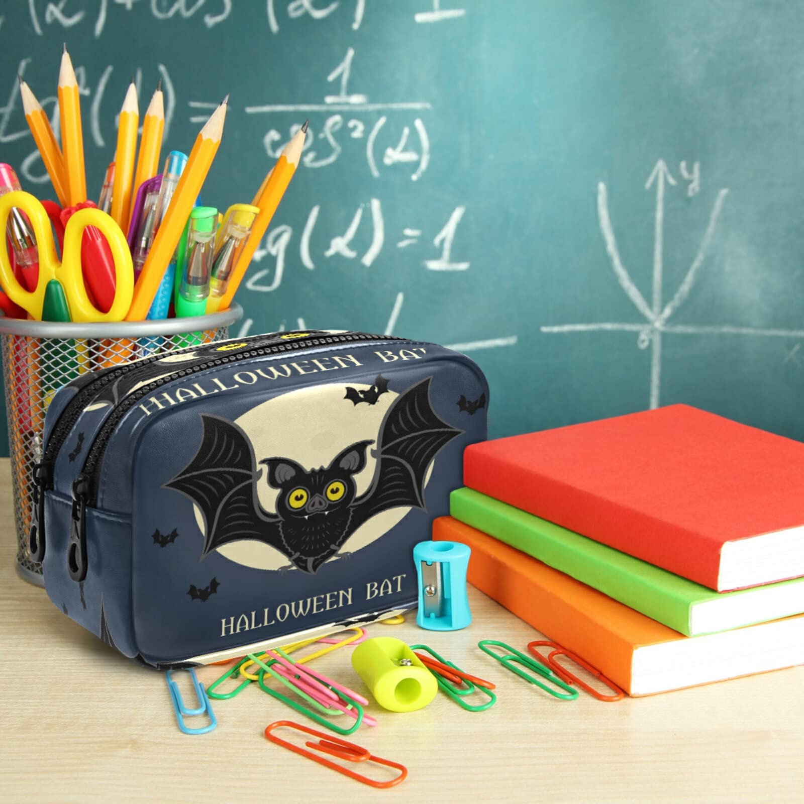 Organisation meets Style! Dieses coole Federmäppchen mit Fledermaus-Motiv bringt Ordnung in deine Stifte und Accessoires - perfekt für Schule, Büro und unterwegs.\n\nMaße und Fassungsvermögen:\n• 21 x 10,5 x 5 cm - großzügig dimensioniert\n• Doppellagig - doppelter Stauraum\n• Hauptfach für lange Stifte und Lineale\n• Vorderfach für häufig genutzte Utensilien\n• Innere Netztaschen für Kleinteile\n\nMaterial und Verarbeitung:\n• Robustes Oxford-Tuch - langlebig und kratzfest\n• Verstärkte Nähte - hält starkem Gebrauch stand\n• Glatter Reißverschluss - läuft leichtgängig\n• Lebendiges Fledermaus-Design - einzigartiger Look\n\nPraktische Features:\n• Elastische Schlaufen - halten Stifte sicher\n• Netztaschen - für USB-Sticks und Büroklammern\n• Separate Fächer - optimale Organisation\n• Leicht zu reinigen - einfach abwischen\n\nPerfekt für:\n• Schüler und Studenten\n• Büro und Arbeitsplatz\n• Künstler und Designer\n• Reisen und Unterwegs\n• Als Geschenk für Organisations-Fans\n\nWarum dieses Federmäppchen?\n• Macht sofort gute Laune\n• Extrem praktisch durch viele Fächer\n• Hochwertige Verarbeitung\n• Trendiges Design\n• Fairer Preis\n\nBesondere Details:\n• Fledermaus-Motiv in Blau\n• Halloween-tauglich aber ganzjährig nutzbar\n• Schlankes Design - passt in jede Tasche\n• Leichtes Gewicht - nicht schwer zu tragen\n\nIdeal für:\n• Stifte, Bleistifte, Marker\n• Radiergummis und Spitzer\n• Taschenrechner und Klebezettel\n• USB-Sticks und Kleinteile\n• Persönliche Accessoires\n\nHol dir den Überblick über deine Utensilien - mit diesem stylischen Federmäppchen findest du alles sofort und behältst die Ordnung!