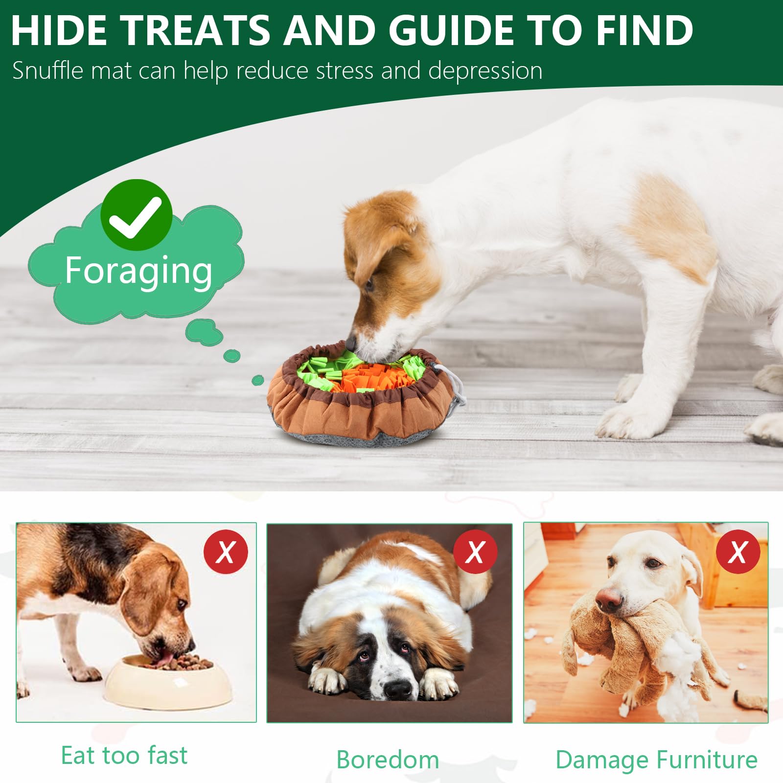 Hey, dein Hund wird diesen Schnüffelteppich lieben! Die 86x48 cm große Matte aus Oxfordstoff und Polarfleece ist total robust und geruchsneutral. Einfach Leckerlis oder Trockenfutter in den bunten Blumen verstecken und dein Hund kann stundenlang suchen und schnüffeln. Das quietschende Karotten-Spielzeug sorgt für extra Spaß! Perfekt für mentale Stimulation und gegen Langeweile - reduziert Stress und beugt Verdauungsproblemen vor. Rutschfeste Unterseite hält die Matte sicher am Platz. Leicht zu reinigen und für alle Hunderassen geeignet. Ob drinnen oder als portable Beschäftigung unterwegs - dieser Schnüffelteppich macht jeden Hund glücklich und ausgeglichen!