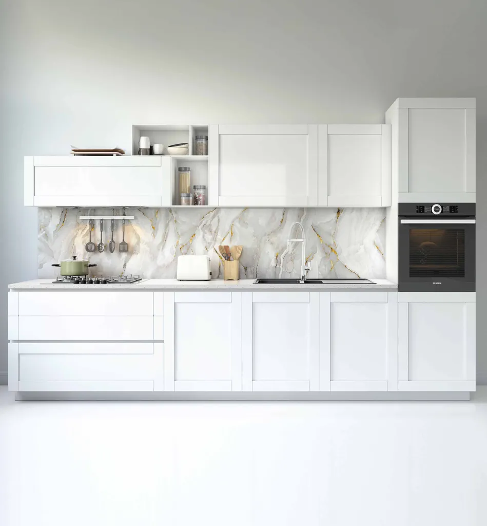 Küchen-Renovierung mal ganz easy! Diese selbstklebende Küchenrückwand-Folie in edlem Marmor-Weiß verwandelt deine alte, langweilige Fliesenwand im Handumdrehen in einen echten Hingucker. Und das Beste: Du brauchst keinen Handwerker!\n\nAus hochwertigem Premium Hart-PVC gefertigt, ist diese Folie alles andere als diese billigen, durchscheinenden Aufkleber. Sie ist stabil, blickdicht und kaschiert selbst tiefe Fliesenfugen perfekt.\n\nMaße: Stolze 340cm x 80cm - passt also auch für größere Küchen. Aber es gibt sie in verschiedenen Größen von 51cm bis 400cm Höhe.\n\nWarum diese Folie so genial ist:\n• Extrem einfach zu verlegen - auch für Ungeübte\n• Blasenfreies Aufbringen mit Rakel oder Handballen\n• Hoch kratzfeste Oberfläche\n• Fettspritzer- und hitzebeständig\n• Leicht zu reinigen und rückstandslos entfernbar\n• Made in Germany - Qualität made in Germany!\n\nSo geht's - in nur 4 Schritten:\n1. Fliesen gründlich reinigen (mit Spiritus entfetten)\n2. Folie zuschneiden und Schutzpapier abziehen\n3. Mit Rakel glatt aufstreichen - um Ecken möglich!\n4. Steckdosen und Kanten mit Cutter ausschneiden\n\nDas Marmor-Design in Weiß ist zeitlos elegant und passt zu jeder Kücheneinrichtung. Ob modern, landhaus oder skandinavisch - diese Optik wirkt immer.\n\nPerfekt für:\n• Mieter, die nichts dauerhaft verändern dürfen\n• Schnelle Küchen-Updates ohne großen Aufwand\n• Budget-bewusste Renovierungen\n• Experimentierfreudige Heimwerker\n• Instagram-worthy Küchen\n\nDie Folie hat einen semi-glänzenden Finish, der edel wirkt aber nicht zu sehr spiegelt. Und sie ist lichtecht - deine schöne Marmor-Optik bleicht also nicht aus.\n\nAlso worauf wartest du noch? Hol dir die Luxus-Küche zum kleinen Preis - ohne Staub, ohne Handwerker, ohne Stress. Einfach Folie bestellen, aufkleben und sich über die komplett verwandelte Küche freuen!\n\nDeine Freunde werden staunen, was du aus deiner alten Küche gemacht hast - und das für kleines Geld!