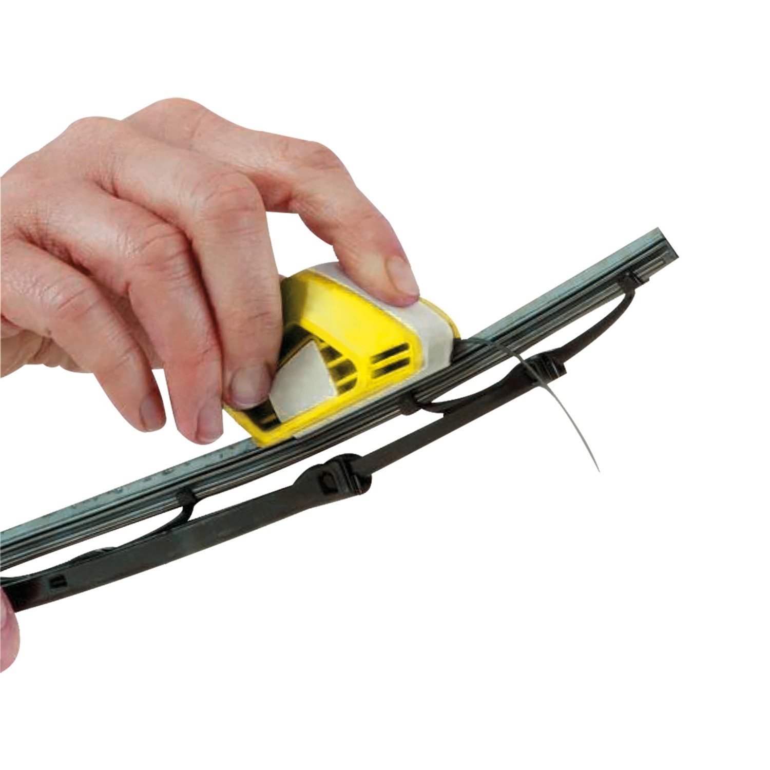 Einfach das alte Wischerblatt mit dem Schwamm reinigen, dann mit dem Schneider die abgenutzte Kante abschneiden - schon wischt dein Wischer wieder streifenfrei. Das spart Geld und schont die Umwelt!