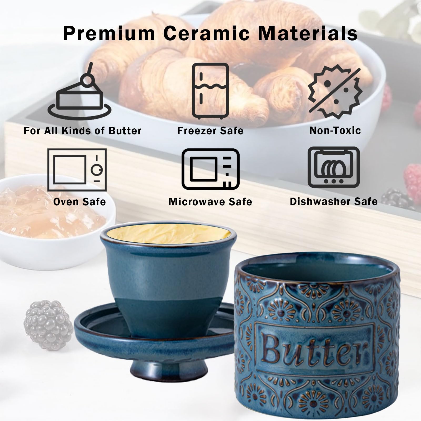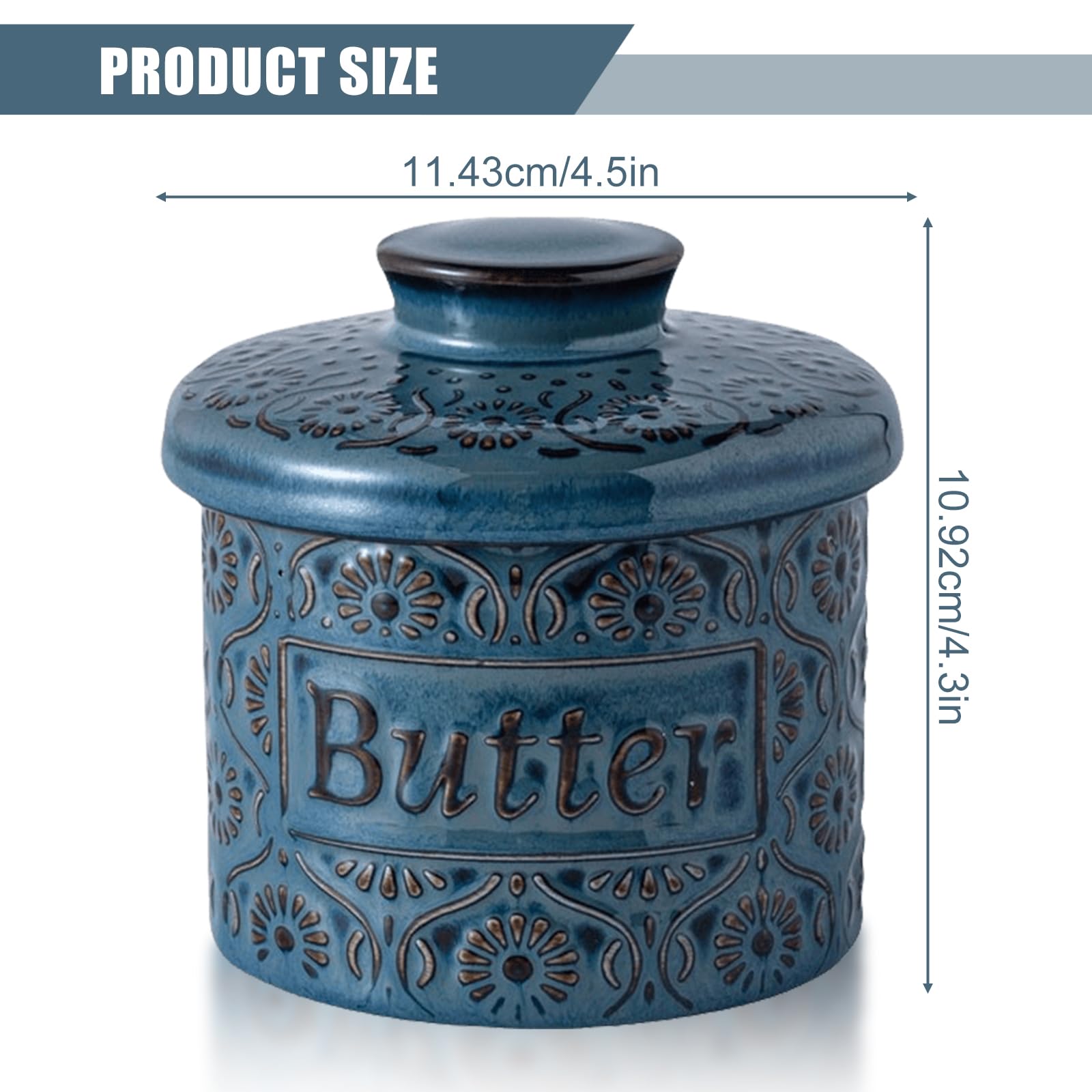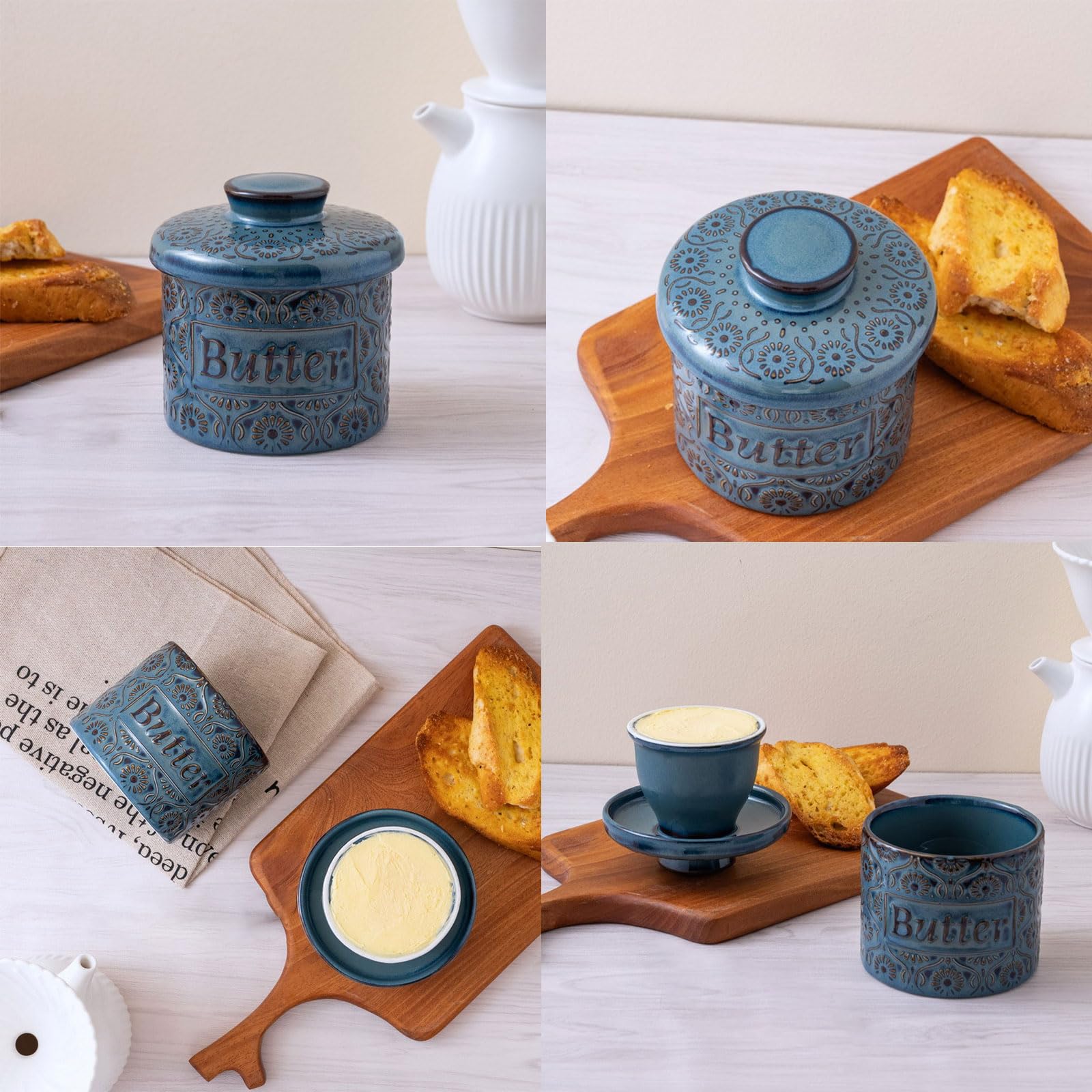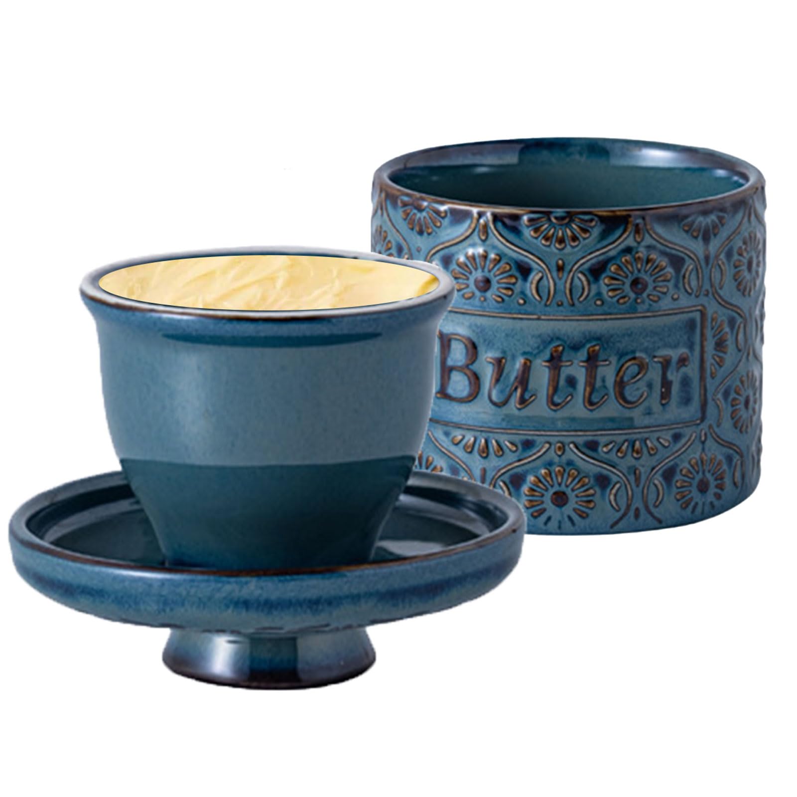 Butter-Liebhaber, hört zu! Diese keramische Butterdose ist ein Game-Changer für deine Küche. Keine harte Butter mehr - dein Brotaufstrich bleibt immer perfekt streichfähig! So funktioniert's: Du füllst weiche Butter in die Glocke und gibst kaltes Wasser in den Untersetzer. Das Wasser bildet eine natürliche Versiegelung - keine Luft kommt ran, also bleibt die Butter frisch. Unglaublich aber wahr: Ungesalzene Butter hält sich bis zu 10 Tage, gesalzene sogar 30 Tage! Ohne Kühlschrank! Die Dose aus feinster Keramik passt super in jede Küche - im blauen Design sieht sie besonders hübsch aus. Maße: 11,5x11 cm - da passt eine ganze Packung Butter rein. Einfach zu reinigen und spülmaschinenfest. Perfektes Geschenk für Foodies!