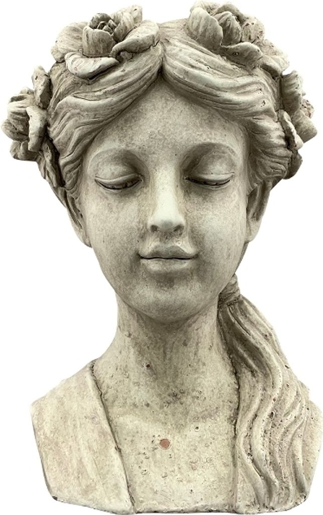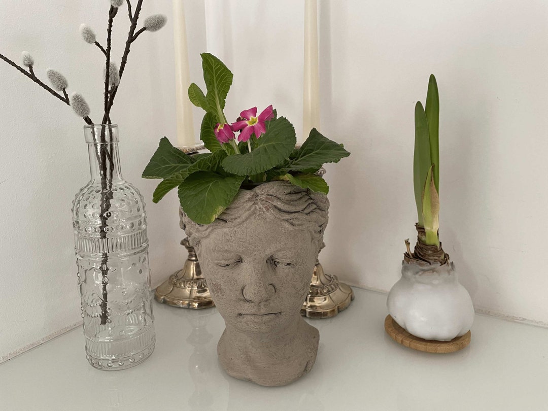 Kunst und Natur vereint! Diese wunderschöne Frauenbüste aus Zement verwandelt sich in einen einzigartigen Blumentopf, der jedes Zuhause verschönert. Mit Maßen von 22 cm Höhe, 17 cm Breite und 22 cm Tiefe ist sie ein echter Hingucker. Aus handgefertigtem Zement mit künstlicher Patina gefertigt, hat jedes Stück seinen eigenen Charakter - kleine Unvollkommenheiten machen es besonders! Unter der Büste sind Filzgleiter angebracht, die Kratzer auf Möbeln verhindern. Ob für Sukkulenten, Gräser, Kräuter oder kleine Blumen - dieser Pflanzkopf bietet Platz für Töpfe bis 9 cm Durchmesser. Tipp: Lege den Topf mit Folie aus und bepflanze ihn vollständig, damit die Pflanze mehr Erde hat. Da kein Abfluss vorhanden ist, empfiehlt sich eine Drainage-Schicht aus Steinchen gegen Staunässe. Wetterbeständig, aber bei Frost bitte ohne stehendes Wasser lagern. Perfekt als Deko für Wohnzimmer, Büro oder als besonderes Geschenk für Pflanzenliebhaber. Ein absoluter Eyecatcher, der klassische Eleganz mit grüner Natur verbindet!