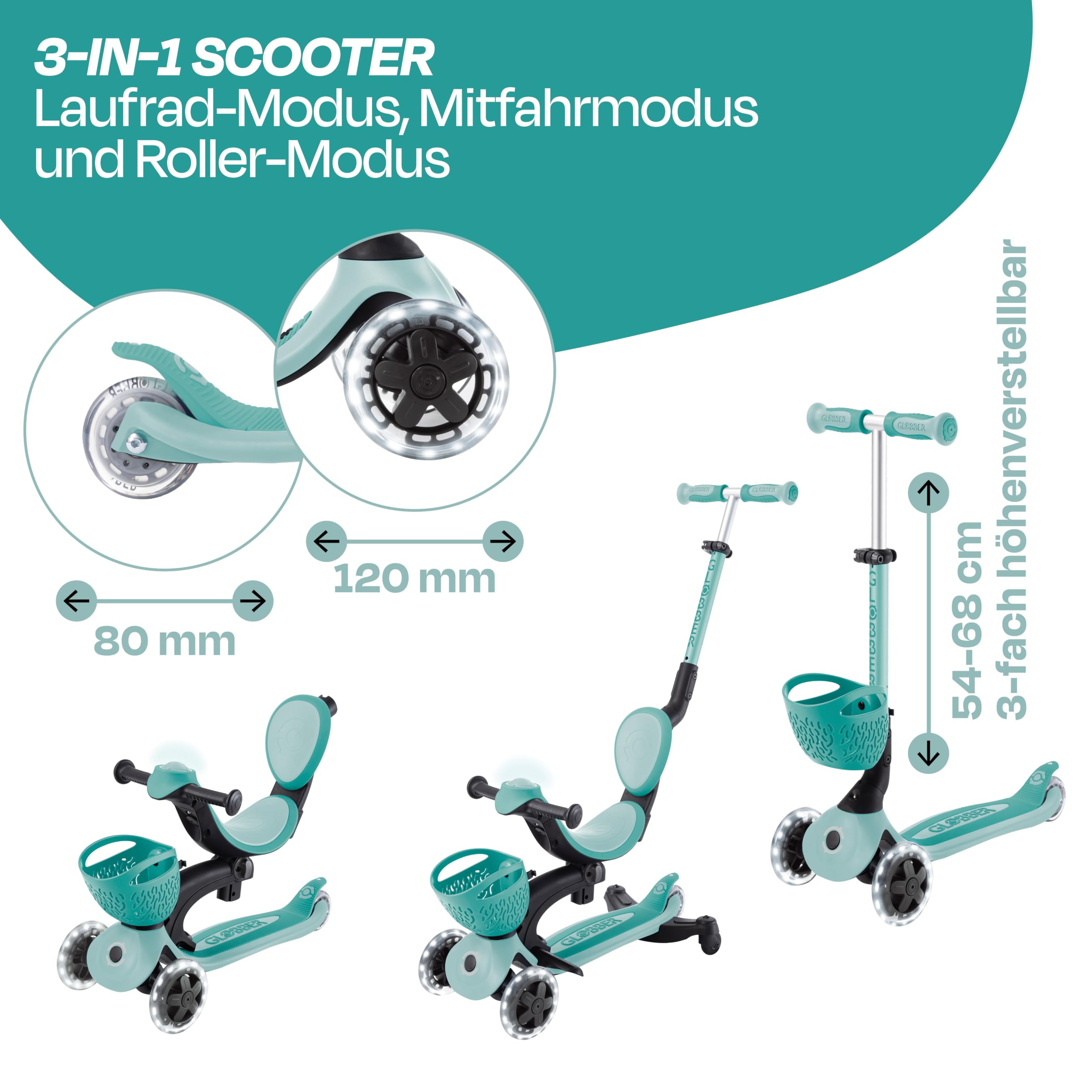 Ein Fahrzeug, drei Möglichkeiten! Der GLOBBER GO-UP wächst mit deinem Kind mit - erst als Dreirad mit Schubstange, dann als Laufrad und später als Tretroller. Die bunten LED-Leuchträder leuchten ganz ohne Batterien und sorgen für mehr Sicherheit im Dunkeln. Alles ist höhenverstellbar und kann ohne Werkzeug umgebaut werden. Der weiche TPR-Sitz ist super bequem und in der Höhe verstellbar. Für die Kleinen von 15-36 Monaten als Dreirad/Laufrad (bis 20 kg) und für Größere von 3-7 Jahren als Tretroller (bis 50 kg). Mehrfach preisgekrönt für das intelligente Design! Perfekt für den Park, Spielplatz oder einfach vor der Haustür. Macht nicht nur irre Spaß, sondern fördert auch Gleichgewicht und Motorik. In coolem Mint-Dunkelmint - da freut sich jedes Kind!
