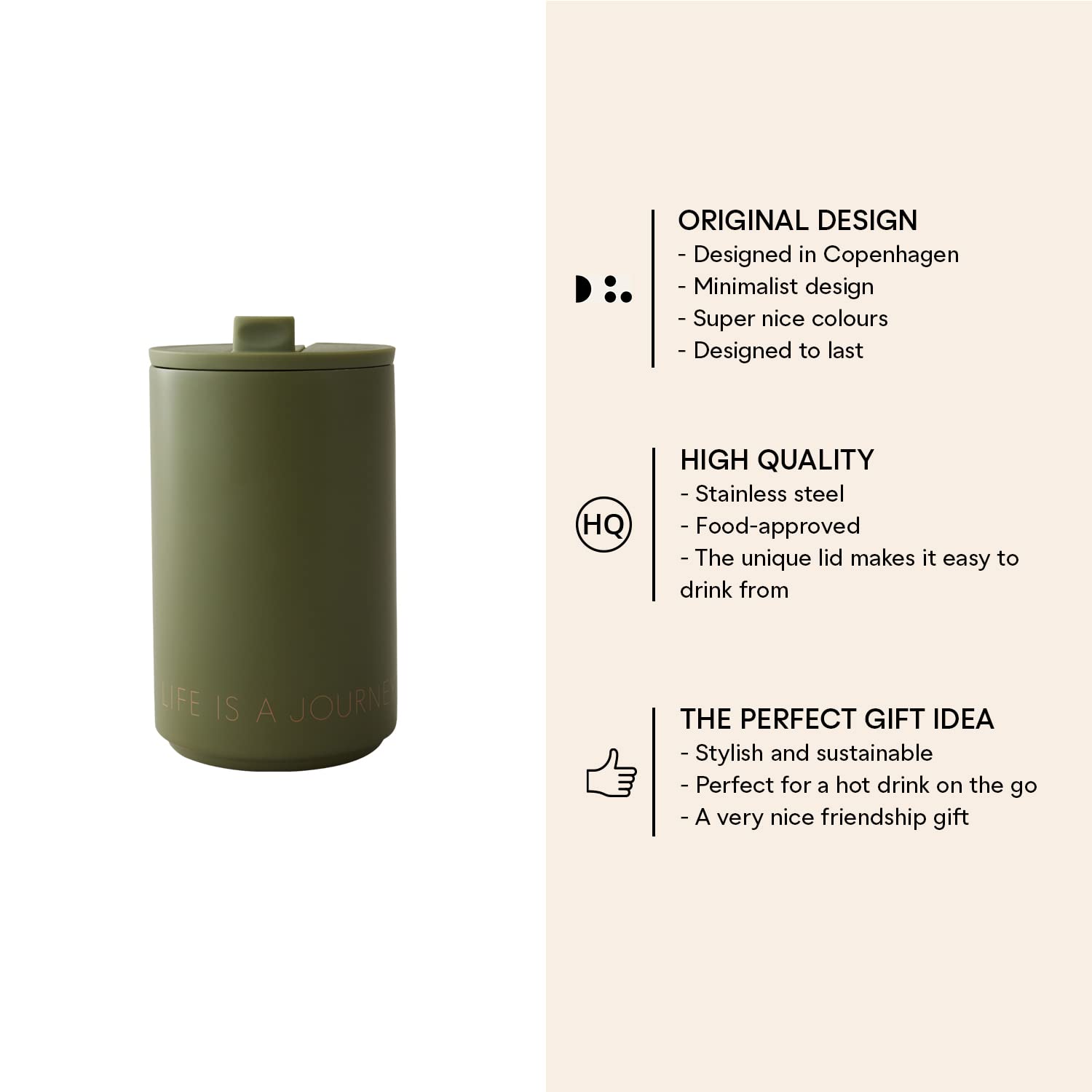 Kennst du das? Du nimmst dir einen Kaffee to go mit und wenn du ihn trinken willst, ist er schon kalt? Mit dem Design Letters Thermobecher gehört das der Vergangenheit an! Der 350ml Becher aus Edelstahl ist doppelwandig isoliert und hält deine Getränke stundenlang heiß - oder wenn du lieber kalte Getränke magst, auch richtig kühl. Das dänische Design ist einfach klasse, und es gibt verschiedene Sprüche zur Auswahl. Der Deckel lässt sich super einfach öffnen und schließen, und der Becher ist auslaufsicher - perfekt für unterwegs! Ob auf dem Weg zur Arbeit, beim Sport oder auf Reisen: Dein Kaffee oder Tee bleibt genau so, wie du ihn magst. Das Beste: Du tust noch was Gutes für die Umwelt, weil du keine Einweg-Becher mehr brauchst. Der Becher ist BPA-frei und macht sich auch super als Geschenk für Freunde oder Familie. Einfach deinen Lieblingsspruch aussuchen und los geht's! Mit 13,1cm Höhe und 7,6cm Durchmesser passt der Becher auch in die meisten Auto-Halterungen.