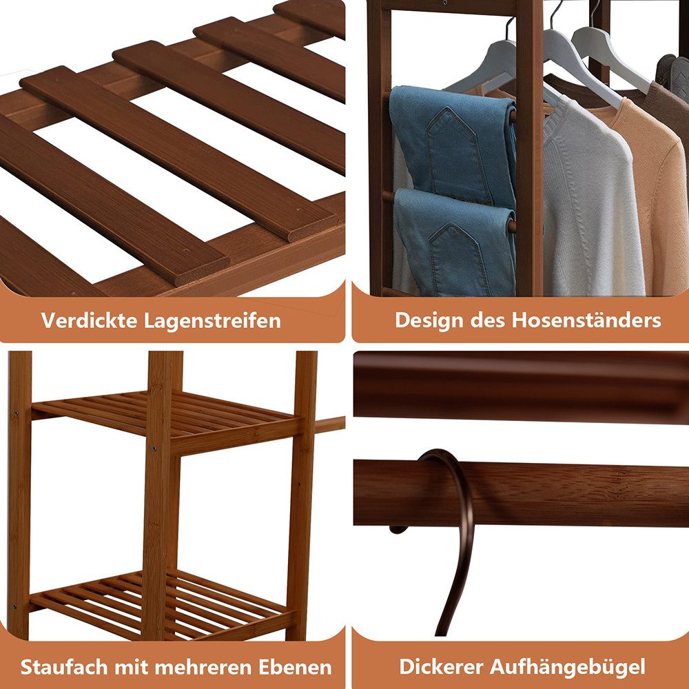 Ordnung für deine Kleidung! Dieser stylische Kleiderständer aus Bambus bringt System in deinen Kleiderschrank. Mit 2 Kleiderstangen für Jacken, Hosen und Shirts sowie 9 Ablageflächen für Schuhe, Taschen oder Accessoires. Maße: 160x40x140cm - also platzsparend aber dennoch geräumig. Die erhöhten Kreuzstangen ermöglichen das Aufhängen auch längerer Kleidungsstücke. Bambus-Material ist robust, umweltfreundlich und sieht dabei noch super aus. Belastbar bis 25kg an den Stangen und 15kg pro Ablage - also wirklich stabil. Einfach zusammenzubauen mit detaillierter Anleitung und allem nötigen Zubehör. Passt perfekt ins Schlafzimmer, die Wohnung oder auch ins Gästezimmer. Modernes Design das zu jedem Einrichtungsstil passt. Endlich alles ordentlich an einem Platz!