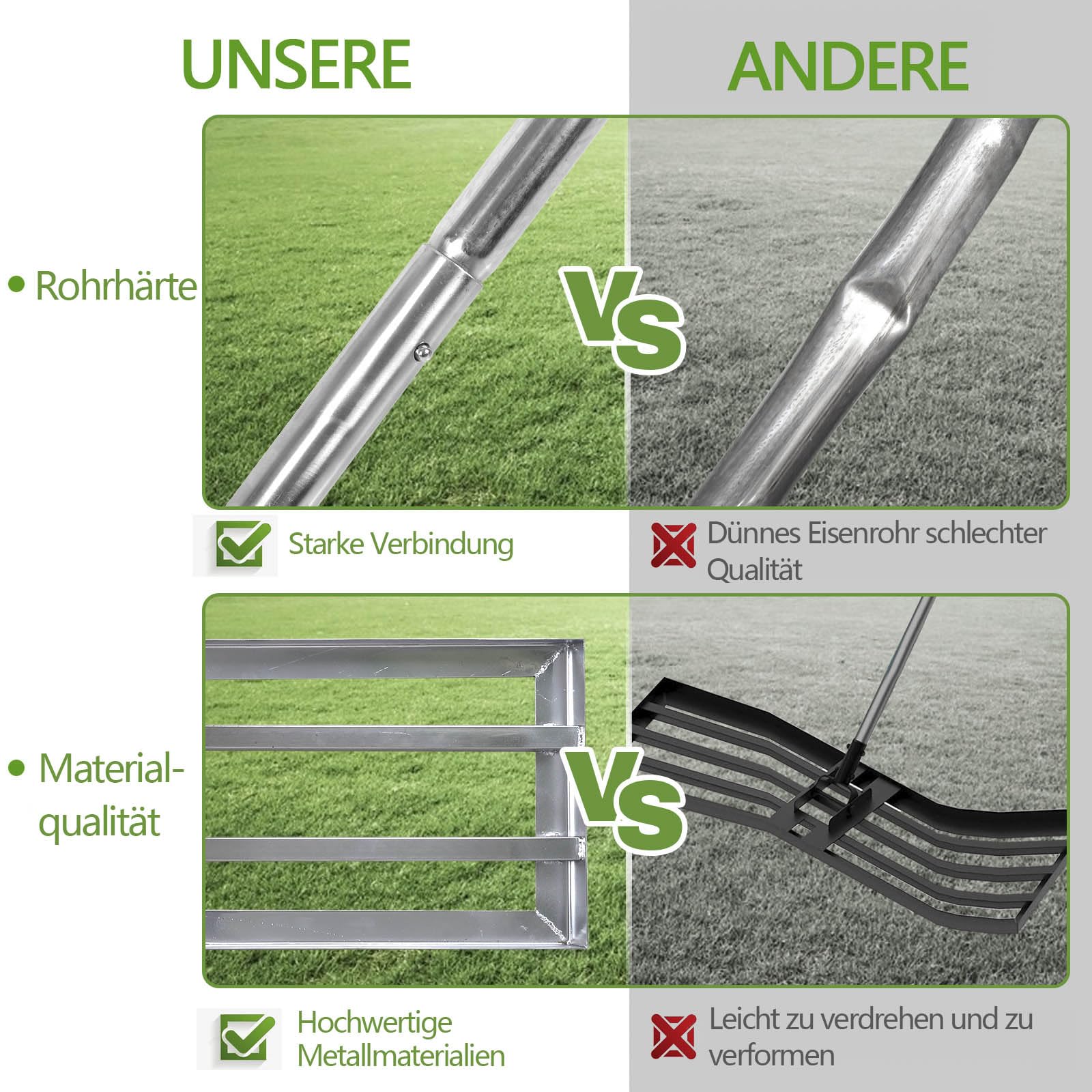 Perfekte Rasenpflege war noch nie so einfach! Dieser professionelle Rasenrakel aus rostfreiem Edelstahl macht aus jedem unebenen Boden eine glatte Fläche. Mit stolzen 220cm Länge kannst du auch größere Flächen schnell und rückenschonend bearbeiten. Das geniale Mehrteil-System lässt sich auf 150cm, 180cm oder 210cm einstellen - perfekt für jede Körpergröße. Einfach zusammenstecken, Winkel einstellen (0-90 Grad) und los geht's! Ob zum Verteilen von Erde, Entfernen von Steinen oder Glätten des Bodens - dieser Rakel ist dein bester Helfer im Garten. Nach getaner Arbeit einfach auseinandernehmen und platzsparend verstauen. Mit nur 4,3kg super leicht zu handhaben. Dein Rasen wird dich lieben!