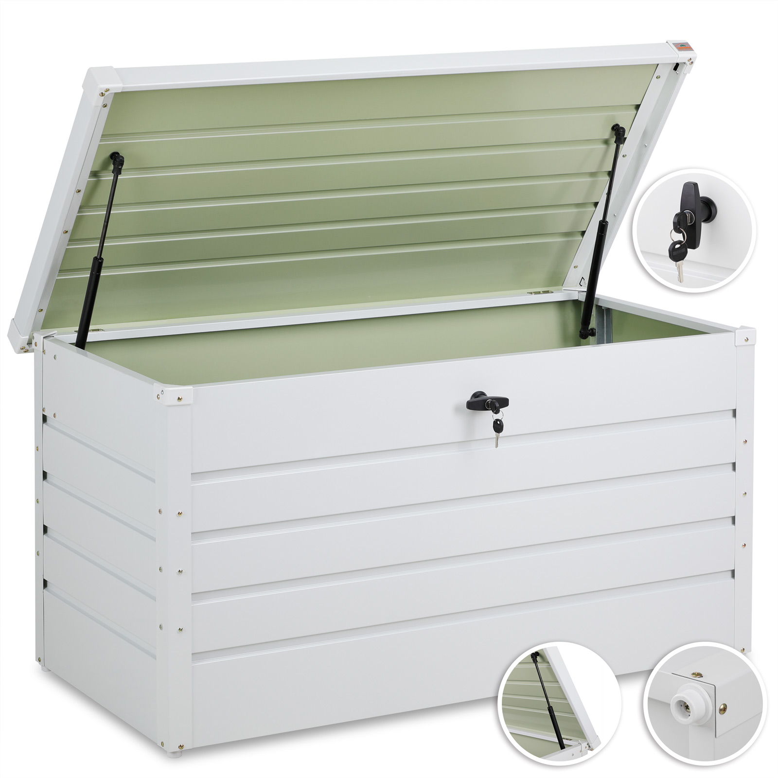 Endlich Ordnung im Garten! Diese riesige Metall-Gerätebox von DEMA bietet satte 770 Liter Stauraum für all deine Gartenutensilien. Ob Gartengeräte, Stuhlauflagen, Spielsachen oder Gartenaccessoires - hier findet alles Platz. Aus robustem, pulverbeschichtetem Stahlblech gefertigt, ist die Box absolut wetterfest und extrem langlebig. Die besondere Pulverbeschichtung schützt zuverlässig vor Korrosion, sodass du dich um Wartung kaum kümmern musst. Praktisch: Der Deckel öffnet sich ganz leicht mit zwei Gasdruckfedern, selbst größere Gegenstände lassen sich so einfach verstauen. Und für zusätzliche Sicherheit gibt's eine Vorrichtung für ein Schloss (nicht im Lieferumfang). Mit den Innenmaßen von 168x68x67 cm ist die Box wirklich geräumig, aber trotzdem kompakt. Die Lieferung kommt teilmontiert - der Aufbau ist kein Hexenwerk. Ein echter Allrounder für Haus und Garten, an dem du lange Freude hast!
