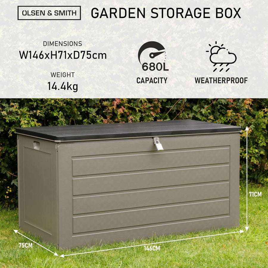 Endlich Ordnung im Garten! Diese praktische Aufbewahrungsbox von Olsen & Smith bietet mit 270 Litern Fassungsvermögen jede Menge Platz für Gartengeräte, Spielzeug, Kissen und mehr. Aus robustem Polypropylen gefertigt ist sie komplett wetterfest und schützt deine Sachen vor Regen und Sonne. Die gasunterstützten Scharniere machen das Öffnen super leicht, und das inklusive Vorhängeschloss sorgt für zusätzliche Sicherheit. Mit den Maßen 109x53x55 cm passt die Box in jede Gartenecke und lässt sich dank der praktischen Griffe leicht bewegen. Der Zusammenbau ist kinderleicht - einfach die Teile zusammenstecken und fertig! Perfekt für alle, die ihren Garten ordentlich und aufgeräumt halten wollen.