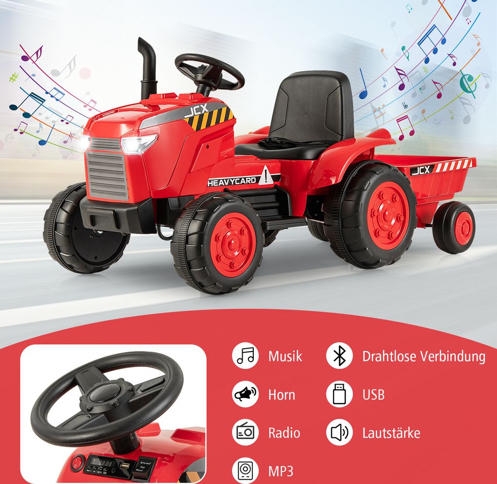 Hey, hier kommt der mega-coole Garvee Elektro-Traktor für die kleinen Fahrer! Mit 12V Power und einem abnehmbaren Anhänger bietet er stundenlangen Spielspaß. Dein Kind kann entweder selbst lenken oder du übernimmst die Kontrolle per Fernbedienung - so macht das Fahren doppelt Spaß und fördert die Eltern-Kind-Interaktion.\\n\\nSicherheit geht vor: Mit Sicherheitsgurten, Handläufen und drei Geschwindigkeitsstufen (langsam, mittel, schnell) ist für sicheres Fahren gesorgt. Die super-stabilen Reifen halten auf jedem Untergrund und die maximale Traglast von 30kg ist mehr als genug für kleine Abenteurer.\\n\\nBesonders toll: Die MP3-Funktion! Dein Kind kann seine Lieblingsmusik abspielen und die Lichter tanzen im Rhythmus mit. Der große Anhänger lässt sich übrigens ganz einfach abnehmen - so wird aus dem Traktor im Handumdrehen ein cooles Vierrad-Fahrzeug.\\n\\nDas perfekte Geschenk für kleine Traktor-Fans! Aus hochwertigem PP und Eisen gefertigt, hält dieser Traktor so einiges aus. Jetzt bestellen und strahlende Kinderaugen garantieren!
