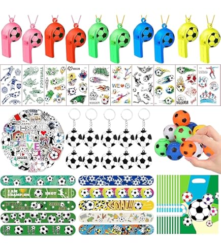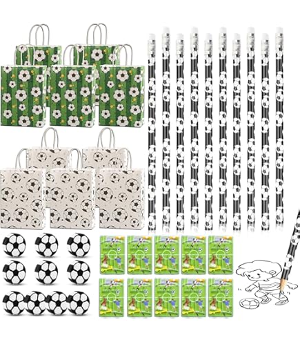 Das perfekte Mitgebsel-Set für jede Fußball-Party! Enthalten sind 50 coole Teile: 10 Fußball-Bleistifte aus Holz, 10 praktische Radiergummis, 10 bunte Armbänder, 10 Geschenktüten mit Fußball-Motiv und 10 spannende Flipperspiele. Alles im klassischen Schwarz-Weiß-Design, das jedes Fußball-Kind begeistert. Die Bleistifte schreiben super, die Armbänder sind verstellbar und die Tüten groß genug für alle Überraschungen. Ideal als Gastgeschenk, für die Schultüte oder einfach so. Mach den nächsten Kindergeburtstag zum unvergesslichen Fußball-Event! Die Kids werden begeistert sein und haben noch lange Freude an den praktischen Geschenken.