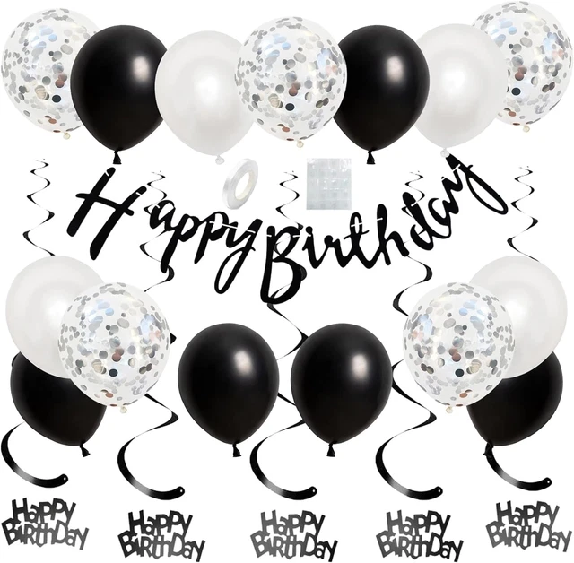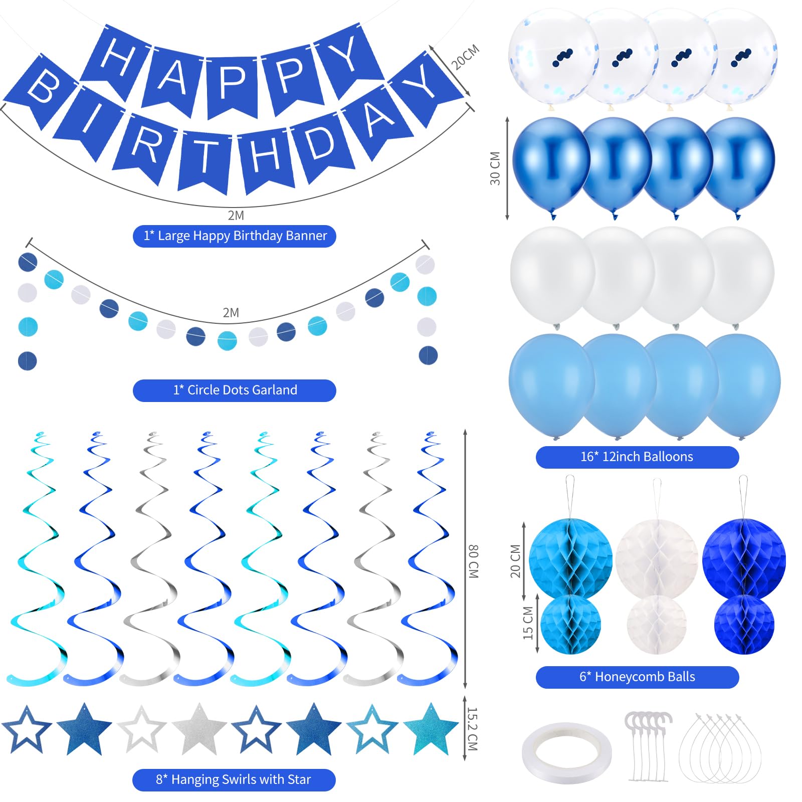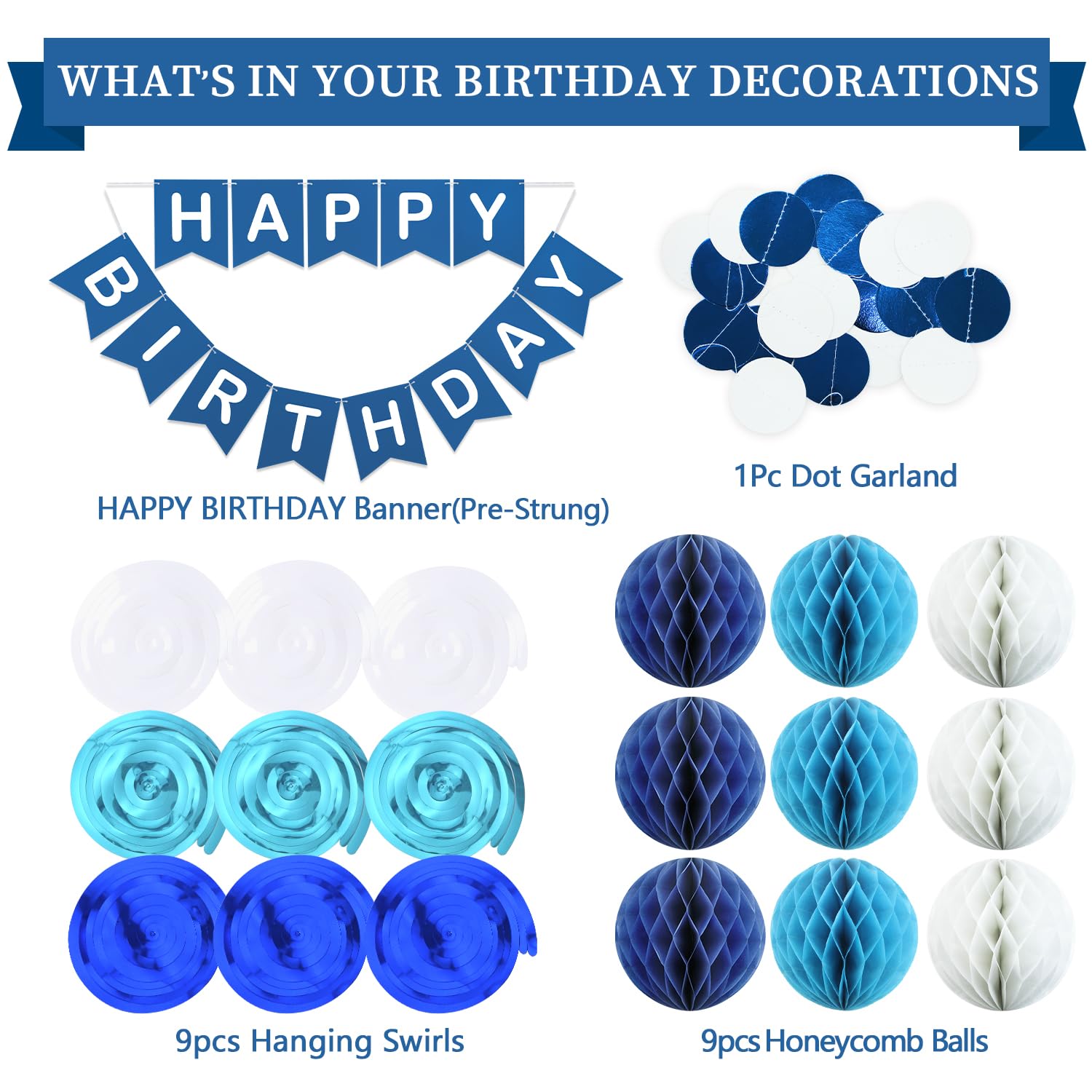 Alles für die perfekte Geburtstagsparty! Dieses marineblaue Deko-Set enthält: 1x Happy Birthday Banner, 6x Wabenbälle, 8x Wirbelquasten und 1x Kreispunkt-Girlande.