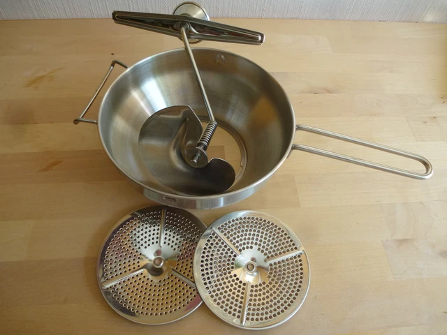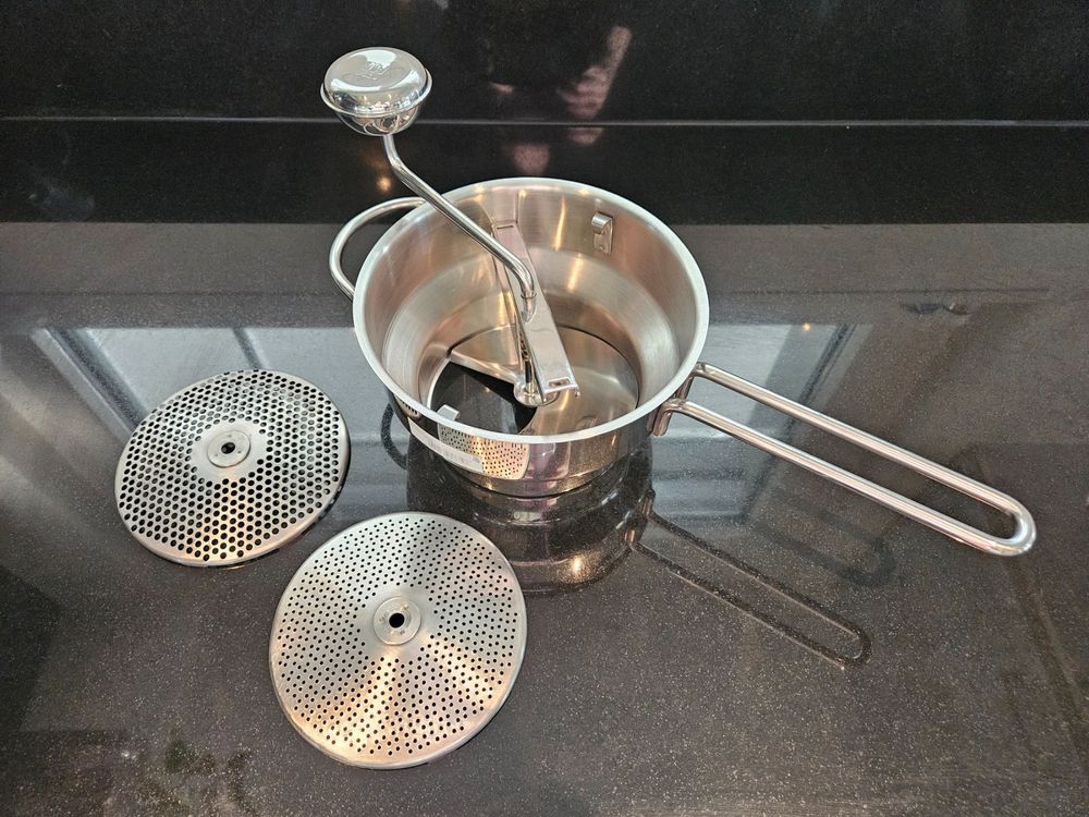 Für alle, die gerne kochen und passieren! Diese Cuydesa Passiermühle in sonnigem Gelb ist ein echter Küchenklassiker. Mit 20cm Durchmesser und praktischem eingebautem Stampfer aus Kunststoff wird das Passieren zum Kinderspiel. Im Lieferumfang sind zwei verschiedene Siebplatten enthalten - so kannst du je nach Bedarf feiner oder gröber passieren. Die Mechanik ist aus hochwertigem Edelstahl gefertigt und damit rostfrei und langlebig. Ob für Tomatensoße, Fruchtmus, Suppen oder Babynahrung - mit dieser Passiermühle gelingt alles perfekt. Die Maße von 32x19,5x11cm machen sie kompakt und platzsparend. Ein unverzichtbares Utensil für jede gut ausgestattete Küche - ob für Hobbyköche oder Profis!