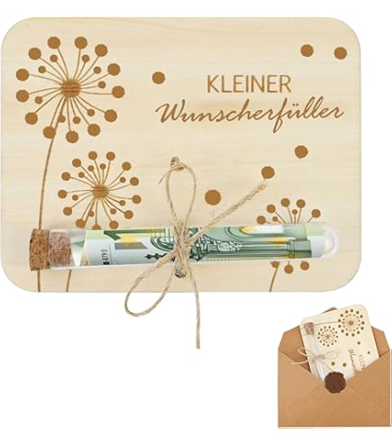 Wow, was für eine coole Idee für Geldgeschenke! Diese Geschenkbox macht aus langweiligen Scheinen was Besonderes. Enthält: stabile Holzkiste, zarte Trockenblumen und transparentes Reagenzglas für die Geldscheine. Sieht total edel aus und ist viel persönlicher als einfach nur nen Umschlag. Perfekt für Geburtstage, Hochzeiten oder andere Anlässe. Danach kann die Box als Schmuckkästchen oder Aufbewahrung weiterverwendet werden. Einfach Geld rein, Deckel zu - und du hast ein Geschenk, das wirklich in Erinnerung bleibt. Macht Schenken wieder spaßig!