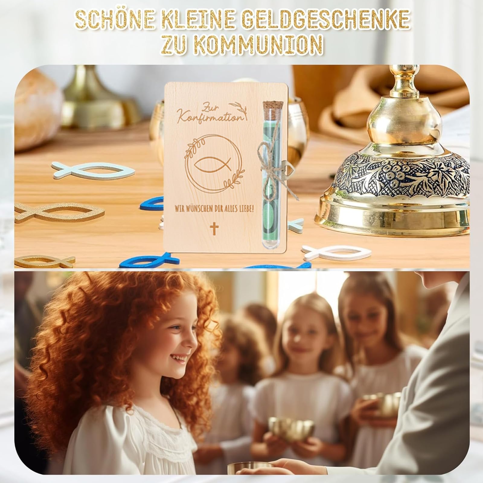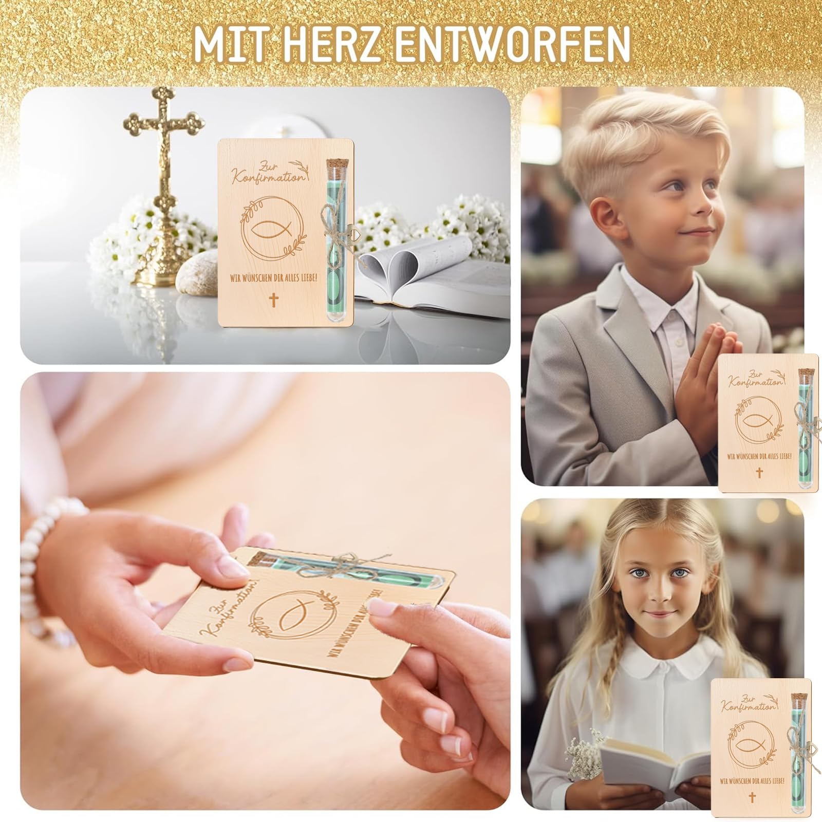 Oh, wie süß ist das denn? Diese total niedliche Geschenkverpackung aus Holz ist perfekt für Konfirmation, Taufe oder andere besondere Anlässe. Das zarte Pusteblumen-Muster ist direkt ins Holz graviert und sieht einfach wunderschön aus.\\n\\nIm Set findest du einen Umschlag (16,2x11,2cm) für Geldscheine oder Karten, plus ein Reagenzglas (10,5x1,5cm) für kleine Geschenke oder kreative Geldgeschenke. Der kleine Herzanhänger mit 1,5cm Durchmesser rundet das Ganze perfekt ab.\\n\\nAus hochwertigem Gelbholz gefertigt, liegt die Verpackung super in der Hand und sieht richtig wertig aus. Mit dem beiliegenden Juteband kannst du alles noch persönlicher gestalten.\\n\\nEgal ob für Jungen oder Mädchen - diese Verpackung macht aus einem einfachen Geldgeschenk etwas ganz Besonderes. Viel schöner als ein langweiliger Umschlag und garantiert ein Highlight auf jedem Geschenketisch! Perfekt um zu zeigen, dass man sich wirklich Gedanken gemacht hat.