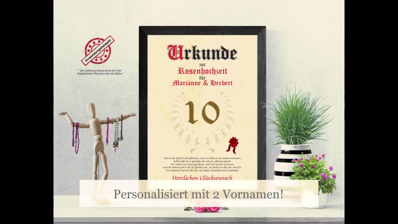 Zur Rosenhochzeit mal was richtig Persönliches verschenken? Diese Urkunde ist perfekt! Kannst komplett individualisieren: 6 verschiedene Motive zur Auswahl, 3 verschiedene Texte (in allen Kombinationen wie Ich/Dir, Wir/Euch etc.). Einfach Namen der Beschenkten, Gratulanten und Hochzeitsdatum angeben - und schon hast du ein total persönliches Geschenk das richtig was her macht. Auf hochwertigem Papier gedruckt (90-170g/m²) im DIN A4 Format. Sieht gerahmt super aus - ob an der Wand oder als Tischdeko. Die Texte sind urheberrechtlich geschützt und wirklich besonders - nicht so dieser Standard-Kram. Wird sicher verpackt in Einlegehülle und Versandtasche mit Kartonwand - kommt also perfekt an. Egal ob für Eltern, Freunde oder Verwandte - mit dieser Urkunde machst du einfach jedem eine Freude. Viel besser als irgendwas Gekauftes - weil's einfach von Herzen kommt. Ein Geschenk das in Erinnerung bleibt und immer wieder Freude macht. Einfach ausfüllen, bestellen und überraschen!