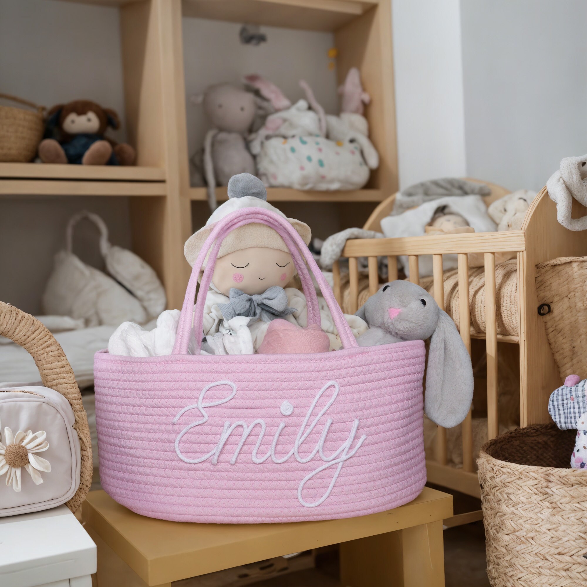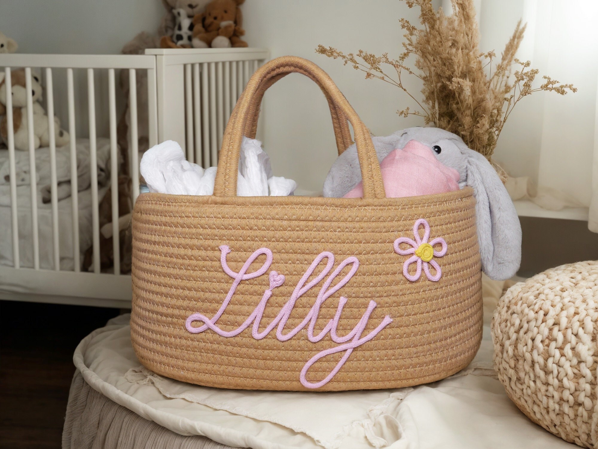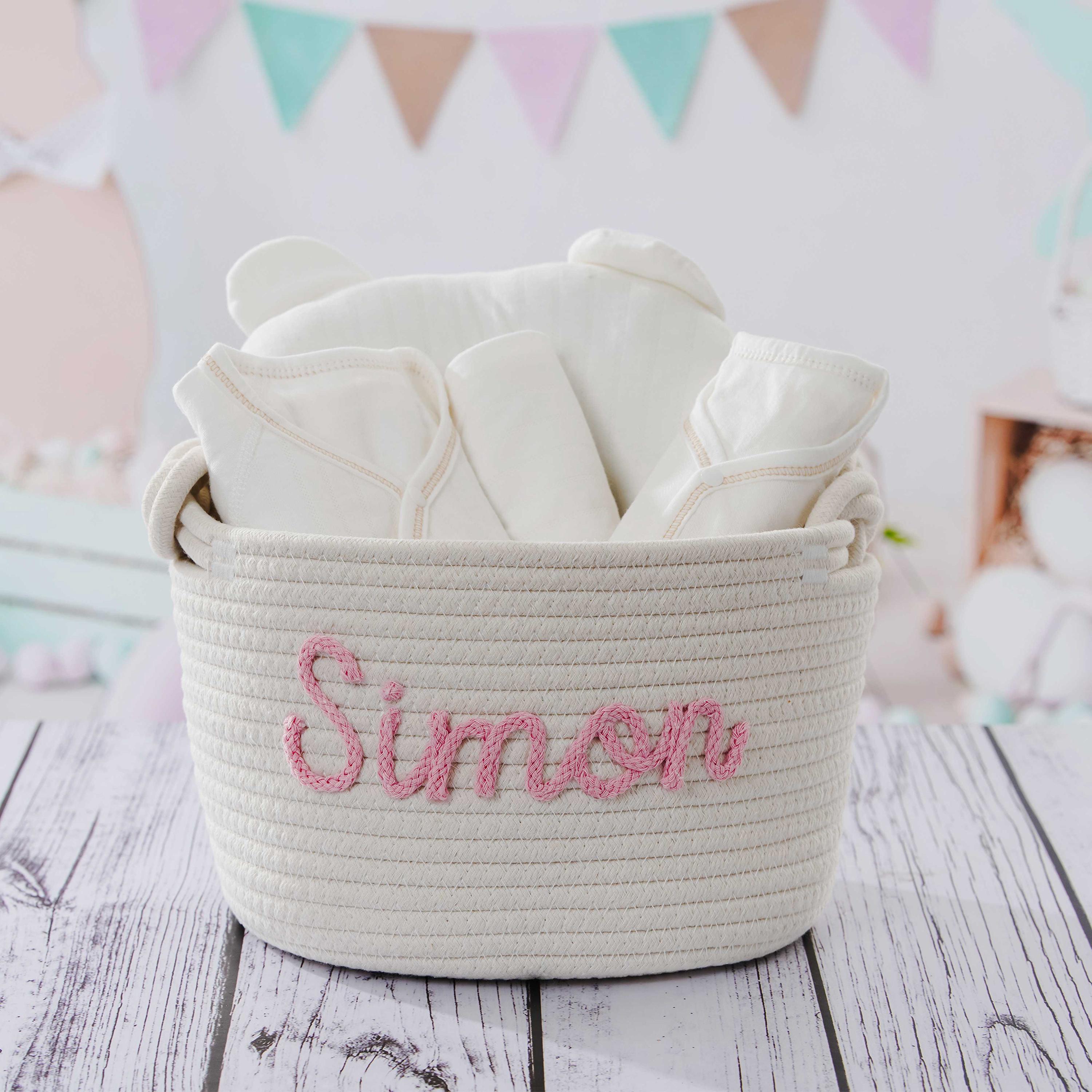 Oh, wie süß! Dieser personalisierte Babykorb ist das perfekte Geschenk zur Geburt oder für die Baby-Party. Handgehäkelt aus 100% Baumwollseil - super weich und hautfreundlich fürs Baby. Mit 24x18cm genau die richtige Größe für Windeln, Spielzeug, Decken oder Kleidung. Du kannst den Namen des Babys personalisieren lassen (am besten bis 8 Zeichen) - das macht es ganz besonders. Sieht super niedlich im Kinderzimmer aus und ist dazu noch mega praktisch. Der Griff ist stabil, also easy zu tragen. Und pflegeleicht: einfach mit feuchtem Tuch abwischen. Ein Geschenk, das garantiert Freude macht und lange in Erinnerung bleibt!