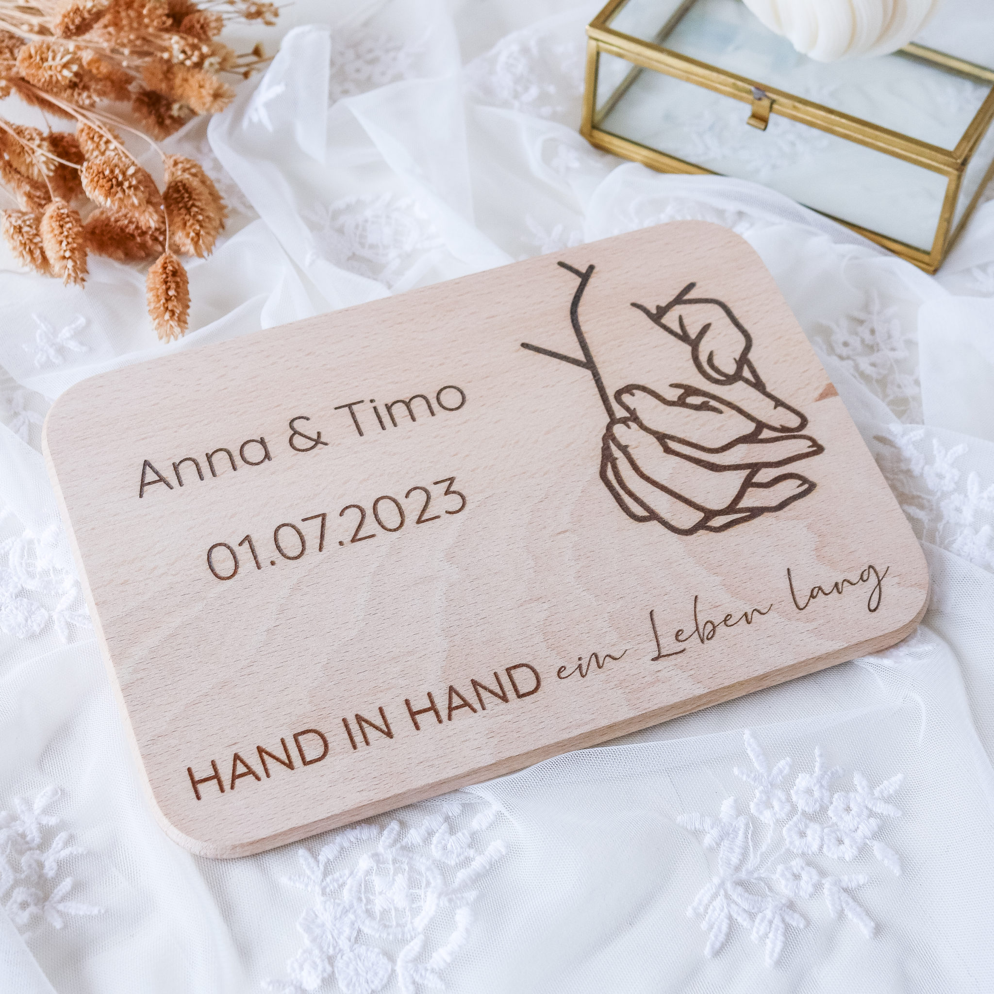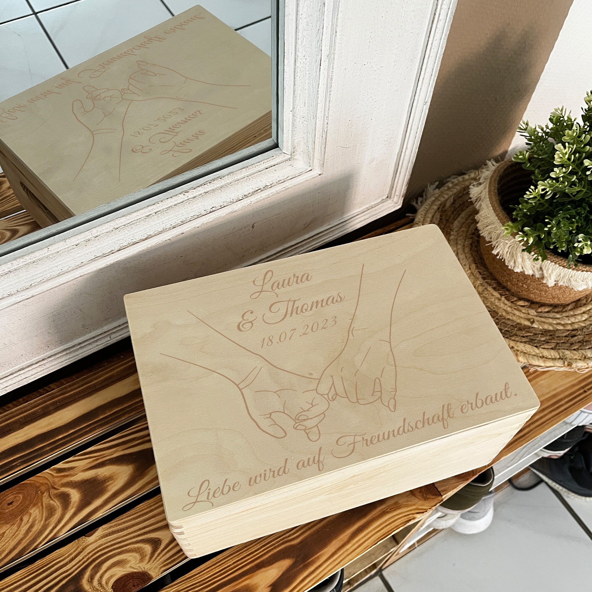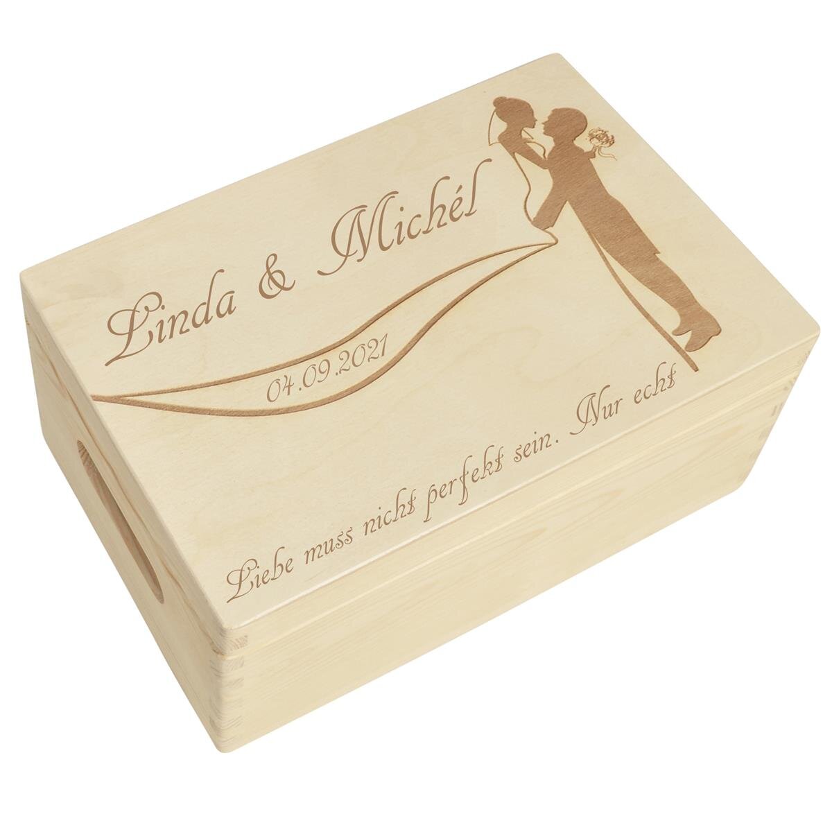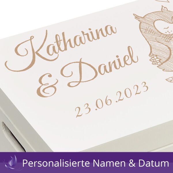 Suchst du ein besonderes Hochzeitsgeschenk? Diese personalisierbare Holzkiste von CHICCIE wird zum einzigartigen Erinnerungsstück! Mit 3D-Herz-Gravur für die Namen des Brautpaares und Hochzeitsdatum. Die 34x18x20cm große Box ist vielseitig nutzbar - als Aufbewahrung für Erinnerungsstücke, Pflanzkiste oder für Werkzeug zum Einzug. Aus hochwertigem Naturholz mit robuster Verarbeitung. Ein Geschenk, das nicht nur gut aussieht, sondern auch praktisch ist und lange Freude bereitet!