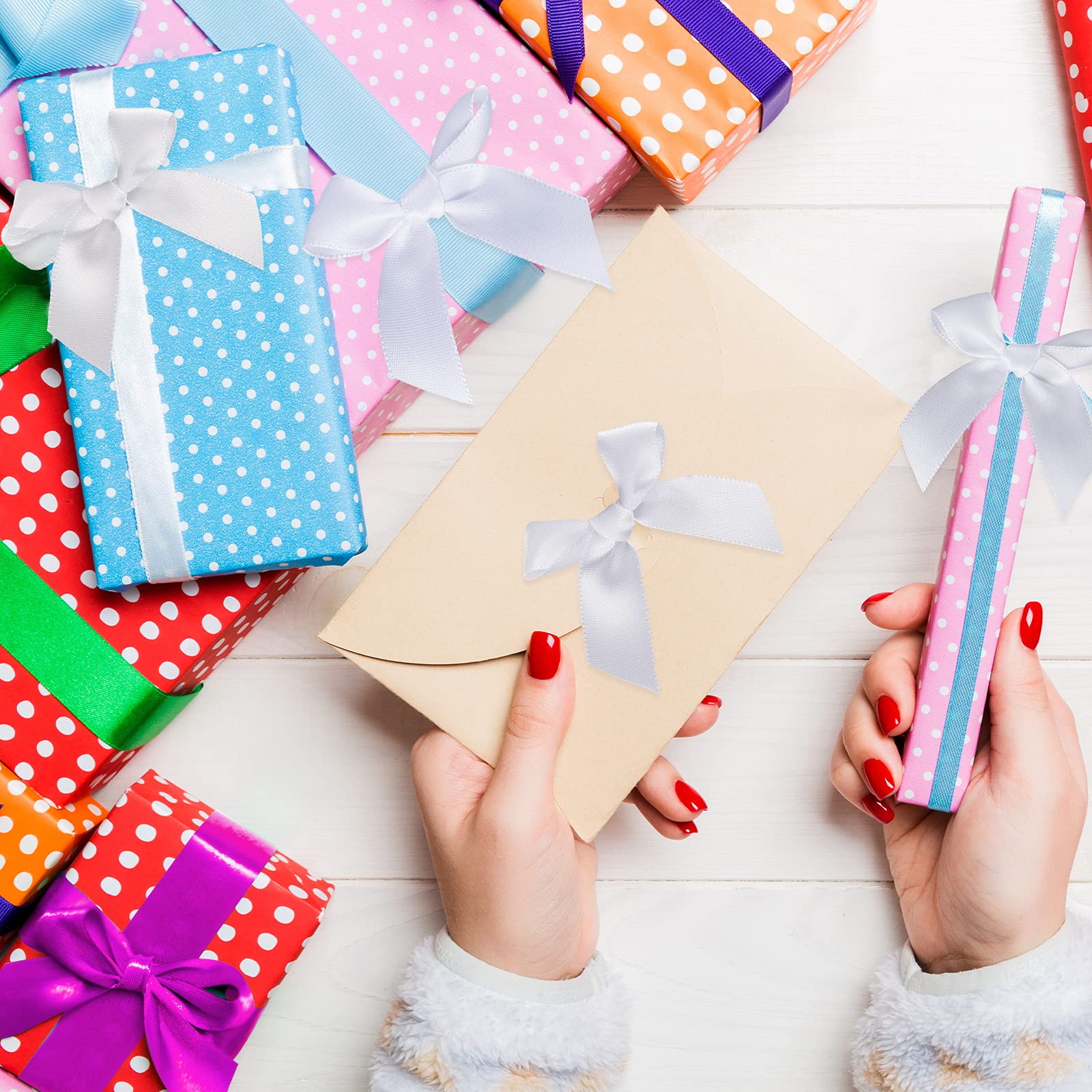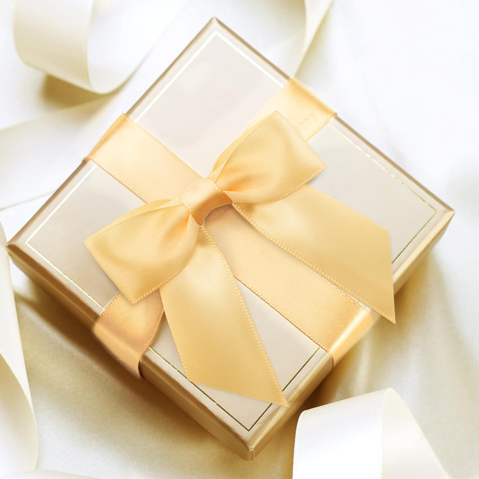 Du willst deine Geschenke mal richtig stylisch verpacken? Mit diesen 50 selbstklebenden Satin-Schleifen wird jedes Präsent zum Hingucker! Die zarten beigen Schleifen sind aus hochwertigem Polyester gemacht - super glatt anzufassen und verblassen nicht so schnell. Das Beste: Sie haben schon doppelseitiges Klebeband auf der Rückseite! Einfach die Schutzfolie abziehen und auf Geschenktüten, Schachteln oder Karten drücken - kein extra Kleber nötig. Mit 7 cm Größe sind sie genau richtig, um deine Geschenke perfekt in Szene zu setzen ohne zu übertreiben. Egal ob für Geburtstage, Weihnachten, Valentinstag oder Hochzeiten - diese Schleifen machen aus jeder Verpackung was Besonderes. Aber nicht nur für Geschenke: Du kannst sie auch für Haarschmuck, im Scrapbook, für Parfümflaschen oder zur Deko im Haus verwenden. 50 Stück sind mehr als genug für alle deine Bastelprojekte - und sie sehen viel teurer aus als sie sind!