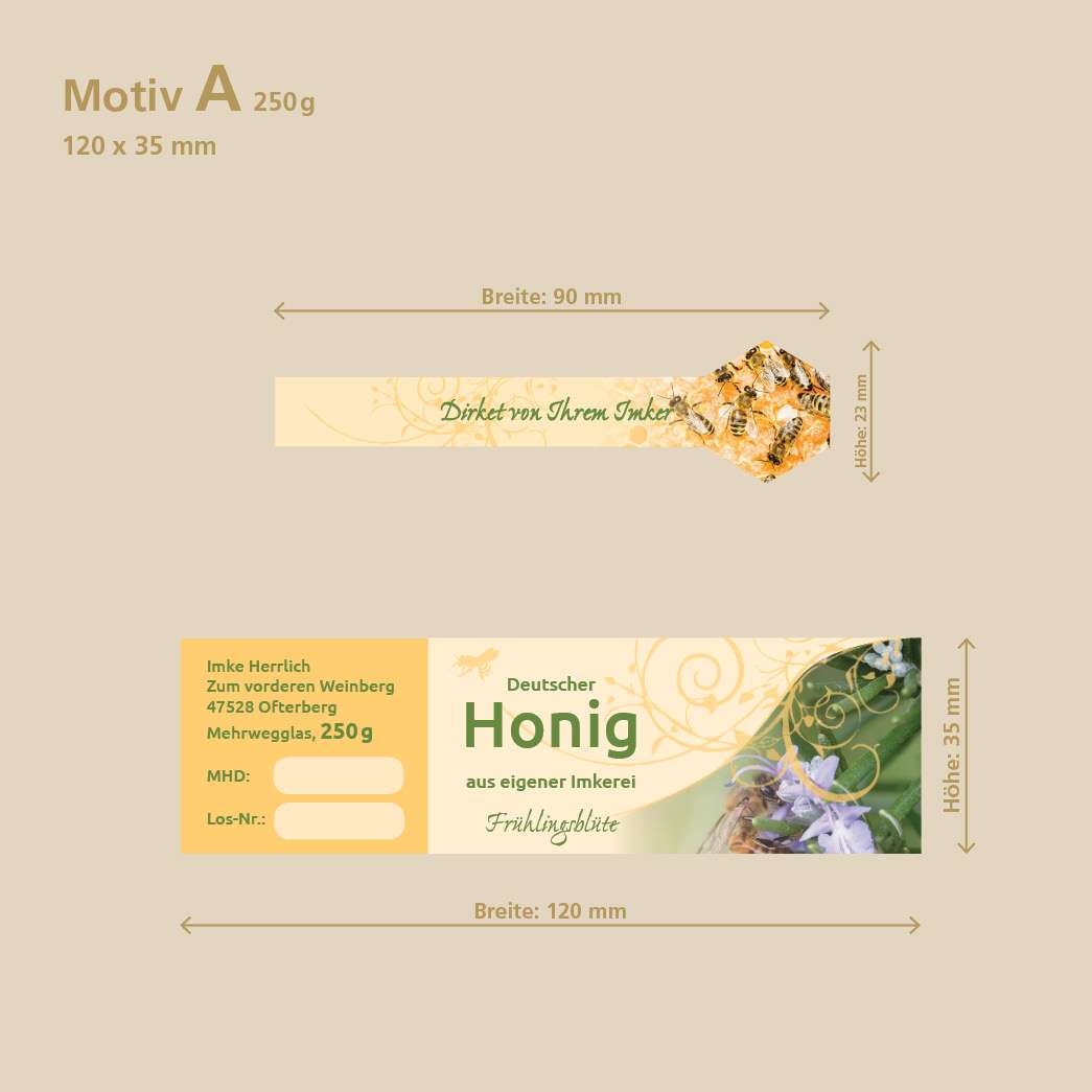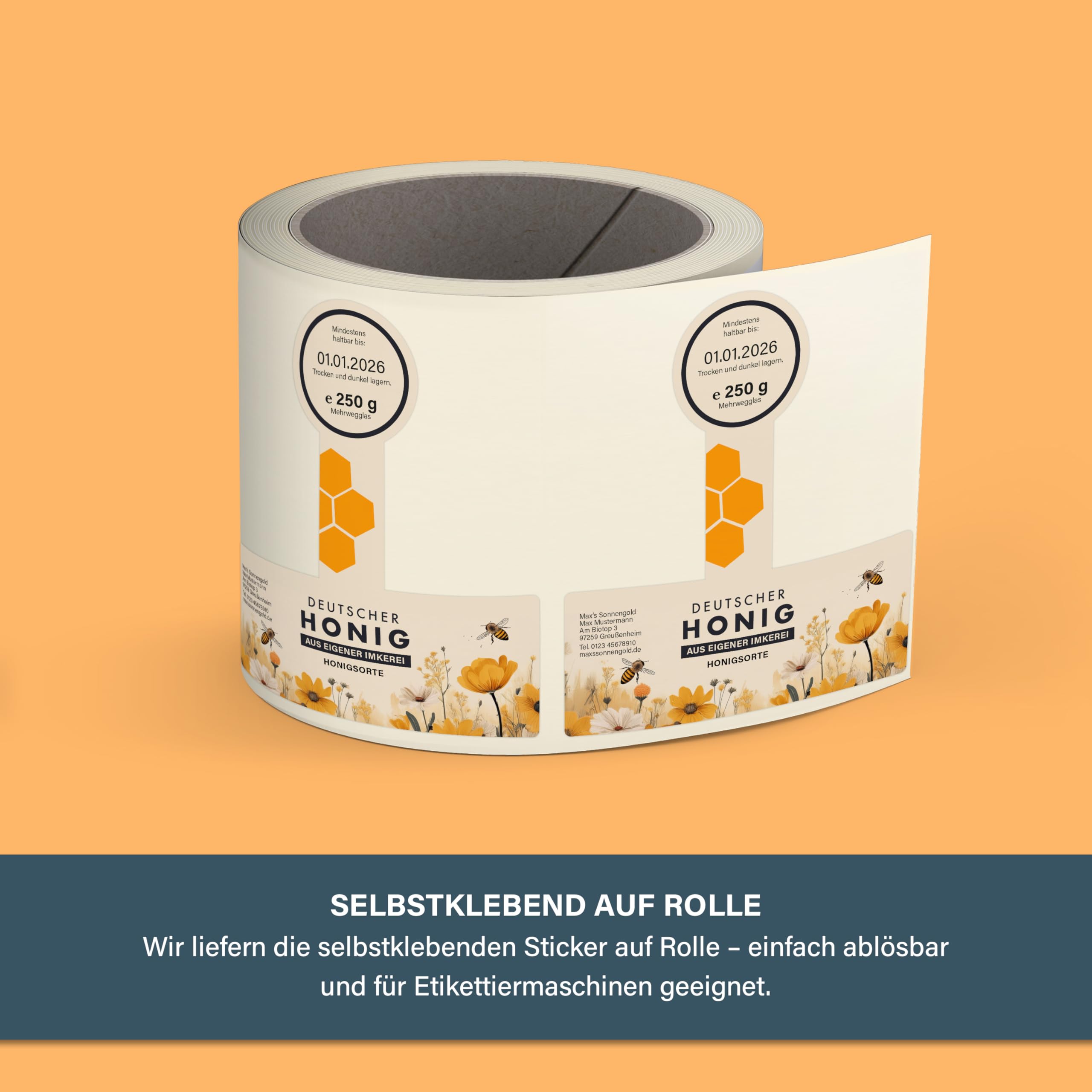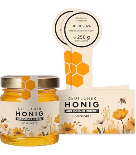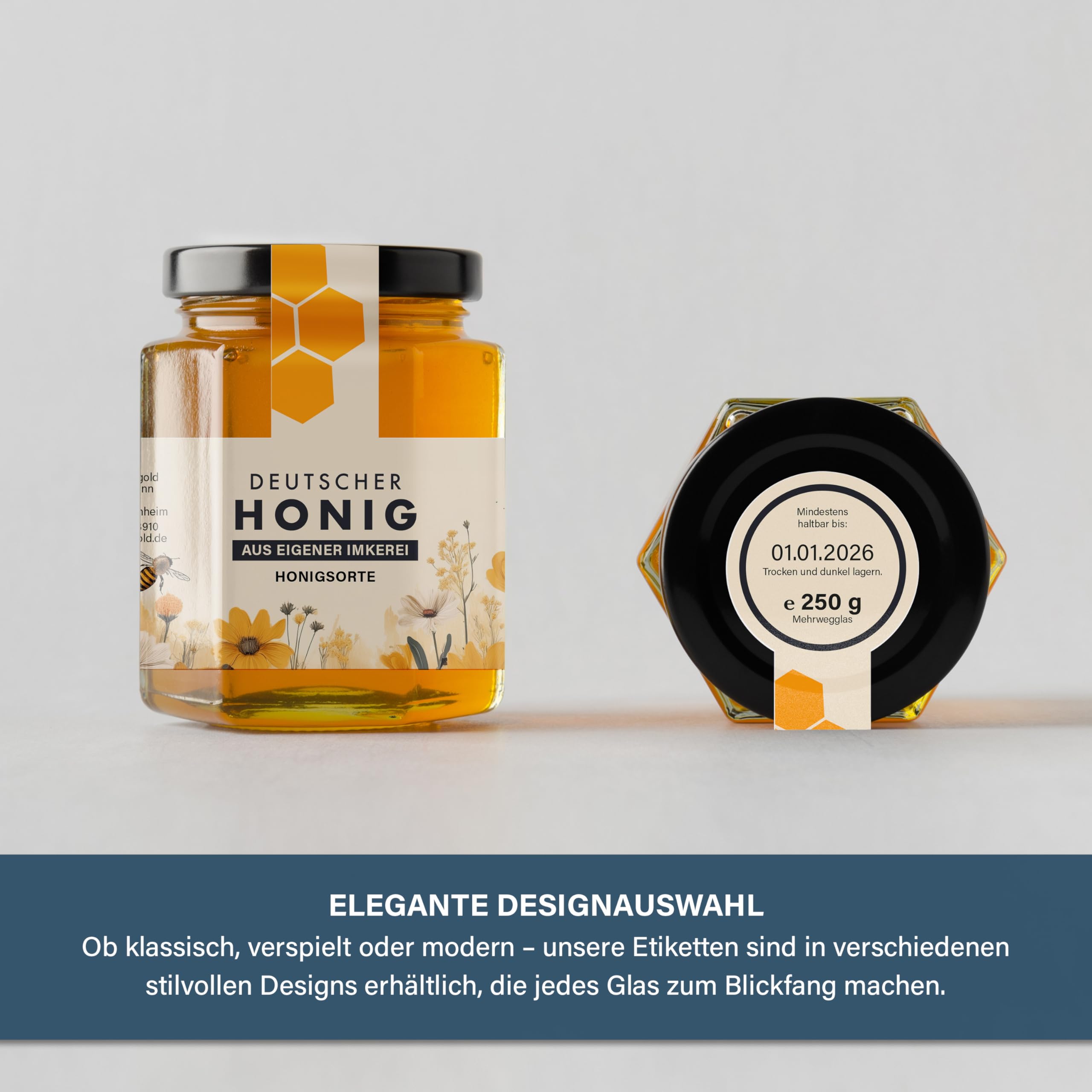 Hey, mach deinen selbstgemachten Honig zum absoluten Verkaufsschlager! Diese professionellen Etiketten mit klassischem Gewährverschluss sehen nicht nur super aus, sondern erfüllen auch alle gesetzlichen Vorschriften. Einfach online personalisieren mit Honigsorte, MHD und deinen Kontaktdaten - wir drucken alles für dich! Die Aufkleber sind wasserlöslich und lassen sich rückstandslos entfernen, falls du die Gläser wieder verwenden willst. Maße: Bauchlabel 10,5x4,3cm, Deckelaufkleber 4cm Durchmesser. Wird auf Rolle geliefert - perfekt für Handaufkleber oder Etikettiermaschinen. Hergestellt in Süddeutschland auf 90g Haftpapier. Viele Designs verfügbar, teilweise mit edler Goldprägung. Ab 25 Stück bestellbar - ideal für Imker, Hofläden oder Marktstände. Dein Honig wird damit zum echten Hingucker!