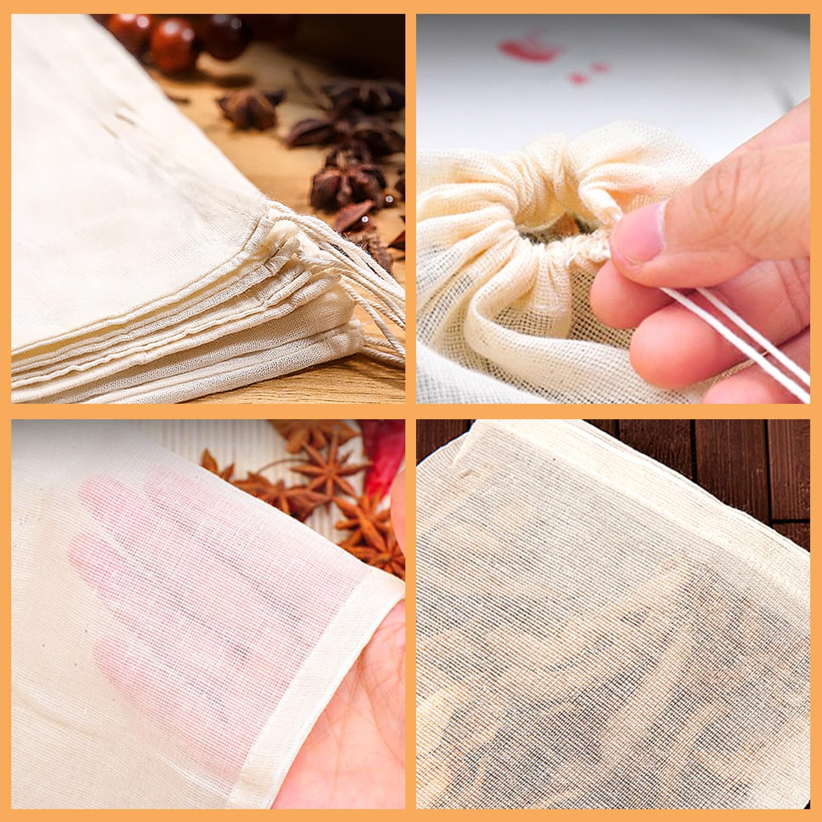 Praktische Gewürzbeutel aus reiner Baumwolle! 60 Stück im Set, jeweils 10,5x8,5cm groß. Mit Kordelzug zum einfachen Verschließen - nichts rieselt aus. Das feine Musselin-Gewebe hält Gewürze und Kräuter zurück, lässt aber Flüssigkeit durch. Perfekt zum Mitkochen von Gewürzen, für Tee, Kräuteraufgüsse oder als Marinadenbeutel. Wiederverwendbar - einfach ausspülen und trocknen lassen. Umweltfreundliche Alternative zu Einwegbeuteln. Ideal für selbstgemachte Gewürzmischungen, Tee oder Suppenwürze. Ein Küchenhelfer den man immer brauchen kann!