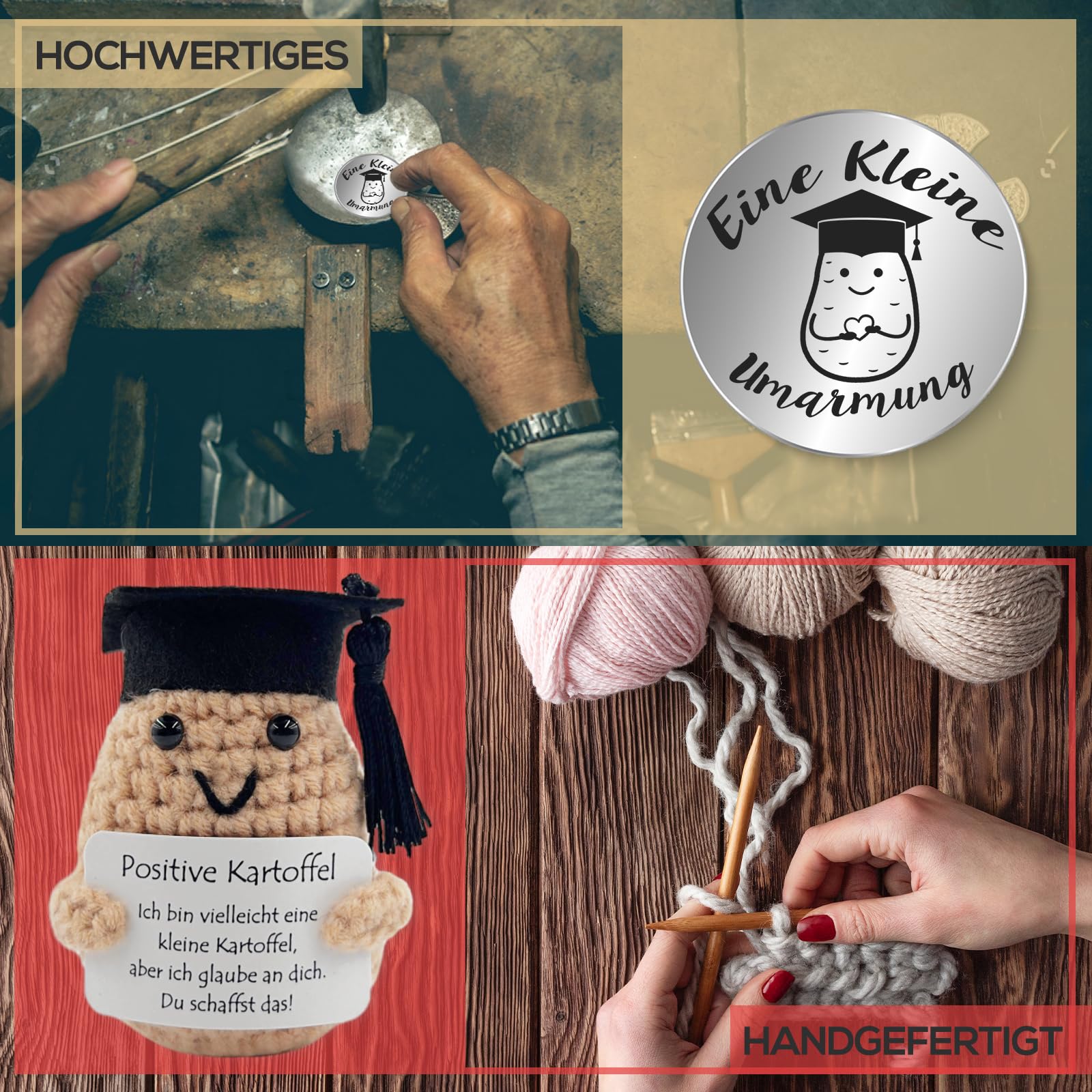 Jede Kartoffel wird liebevoll von Hand aus weicher Wolle gefertigt und behält ihre Form auch nach längerem Kuscheln. Im Lieferumfang ist eine Positive-Energie-Karte enthalten, die Mut macht und an die Stärke des Beschenkten erinnert.