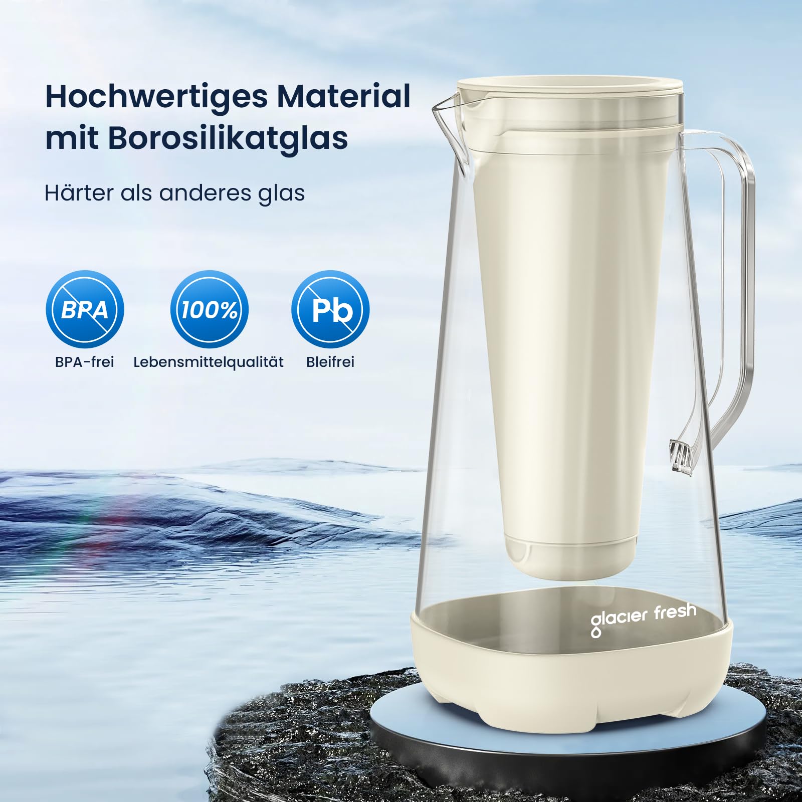 Frisches, gefiltertes Wasser direkt aus dem Kühlschrank! Diese GLACIER FRESH Glas-Wasserfilterkanne mit 3L Fassungsvermögen macht aus Leitungswasser reinstes Trinkvergnügen. Der Doppelfilter mit Aktivkohle und Ultrafiltration entfernt Chlor, Fluorid, Kalk und Schwermetalle wie Blei und Kupfer.