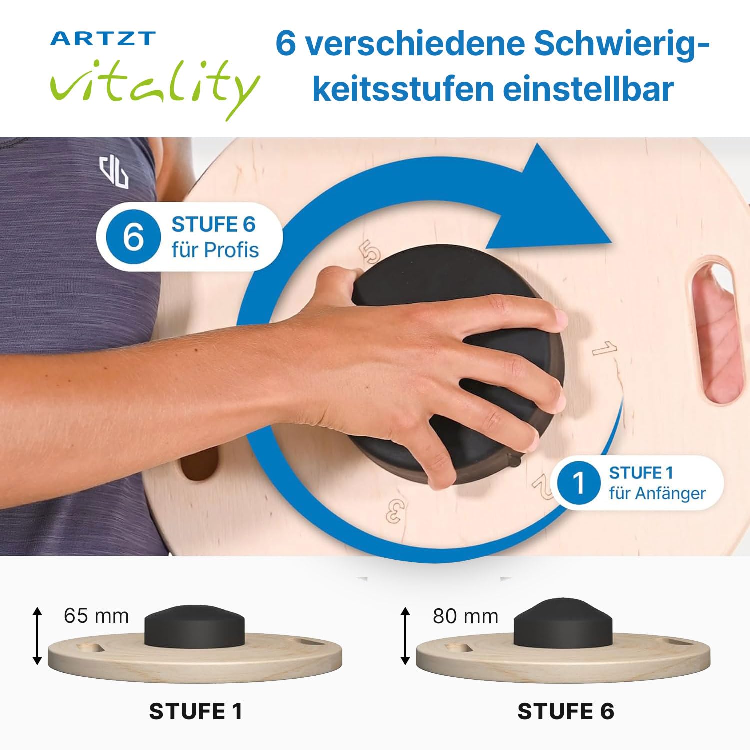 Einfach die Unterseite drehen und schon verändert sich der Durchmesser der Auflagefläche. So kannst du dich langsam steigern und dein Gleichgewicht immer weiter verbessern. Von 65 mm (Stufe 1) bis 80 mm (Stufe 6) Höhe.