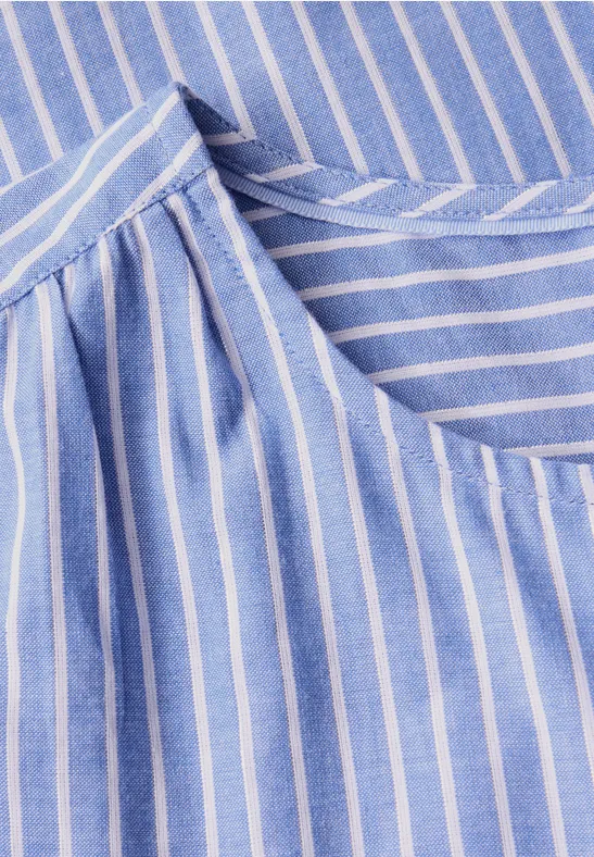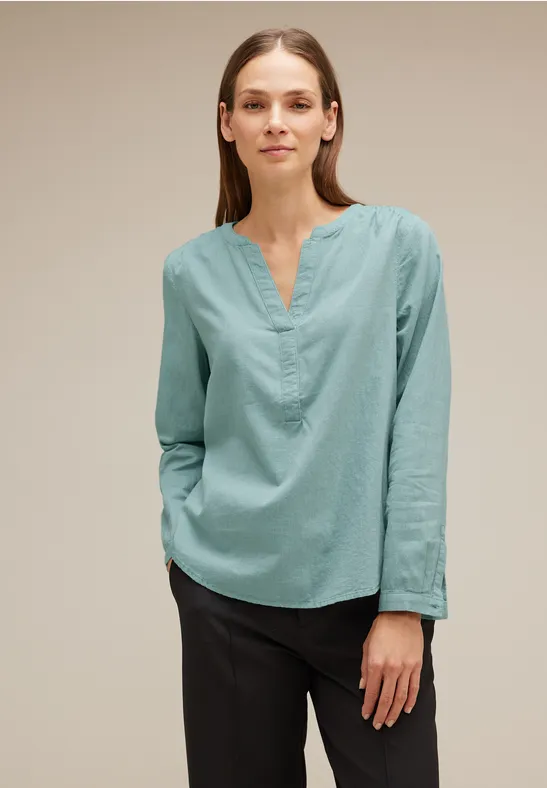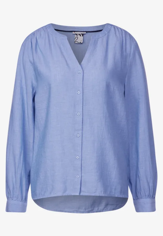 Diese Street One Bluse kombiniert lässigen Style mit dezenter Eleganz! Der Chambray-Stoff mit feinen Glitzereffekten und die Dropped Shoulders sorgen für einen modernen Look. Aus weichem Baumwollmix (97% Baumwolle, 3% Metallfaser) trägt sie sich super angenehm. Der geschlitzte Ausschnitt verleiht das gewisse Etwas. Perfekt für Office, Date oder Freizeit - einfach vielseitig kombinierbar! Street One Qualität, die auffällt ohne aufdringlich zu sein. Ein Must-have für jede modebewusste Frau!