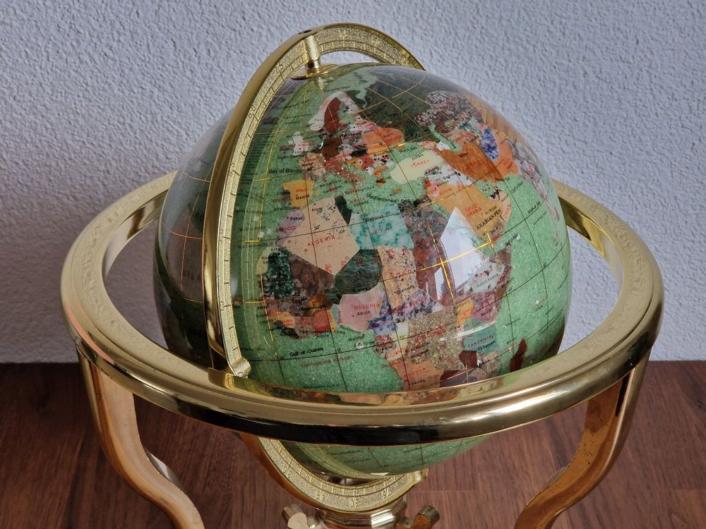 Wow, dieser Globus ist wirklich etwas Besonderes! Handgefertigt aus echten Halbedelsteinen und mit einem stabilen Metallsockel - das ist kein gewöhnlicher Globus, sondern ein richtiges Kunstwerk. Erhältlich in drei Größen: 15cm, 22cm oder 33cm Durchmesser, sodass für jeden Raum die passende Größe dabei ist.\\n\\nWas ihn so einzigartig macht? Die Ozeane sind mit gemahlenem Halbedelsteinpulver in verschiedenen Farben ausgelegt - das sieht nicht nur wunderschön aus, sondern fühlt sich auch ganz besonders an. Die Breiten- und Längengrade sind als feine Metalldrähte eingearbeitet, und die geografischen Details sind hochauflösend gedruckt und super gut lesbar.\\n\\nDie bogenförmigen Metallklammern sind richtig stabil und flexibel zugleich. Perfekt fürs Arbeitszimmer, Büro oder Wohnzimmer - nicht nur als Deko, sondern auch als Lehrhilfe. Ob auf dem Schreibtisch, im Regal oder als Blickfang im Wohnzimmer - dieser Globus zieht garantiert alle Blicke auf sich!\\n\\nUnd das Beste: Er ist manuell drehbar - einfach mal anfassen und die Welt erkunden. Ein tolles Geschenk für Wissbegierige, Reisende oder einfach für alle, die schöne Dinge lieben!
