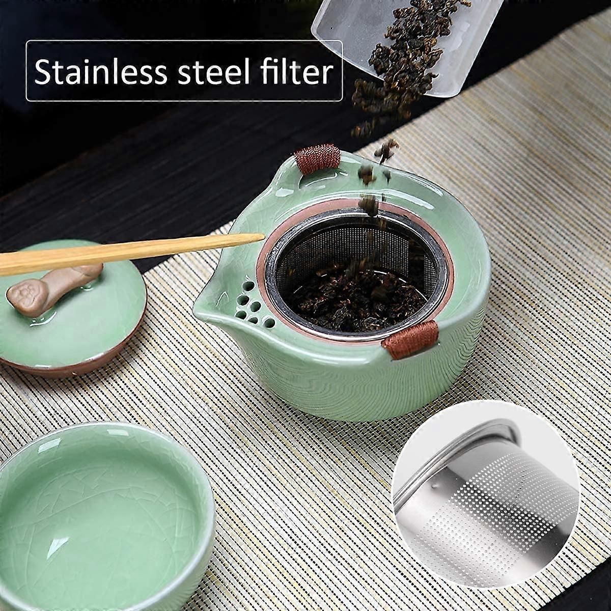 Tee-Liebhaber aufgepasst! Dieses tragbare Gongfu Tee-Set ist dein perfekter Begleiter für unterwegs. Ob im Büro, beim Camping oder auf Reisen - damit braust du überall perfekten Tee. Komplett mit Teekanne, Tassen, Filter, Tablett und Teedose - alles was du brauchst für Oolong, Schwarztee oder Grüntee. Das Beste? Die hochwertige Keramik ist komplett blei- und chromfrei, also absolut unbedenklich. Und die coole Ledertasche macht's super transportabel. Sieht nicht nur gut aus, sondern ist auch praktisch. Perfekt als Geschenk für Tee-Fans, oder einfach mal sich selbst was Gönnen. Einfach aufklappen, Tee aufbrühen und entspannen! Selbst wenn du kein Tee-Profi bist - mit der Anleitung kriegst du das hin. Und falls was kaputt geht? Kein Stress - 30 Tage Rückgaberecht. Also worauf wartest du? Hol dir deine mobile Tee-Oase!
