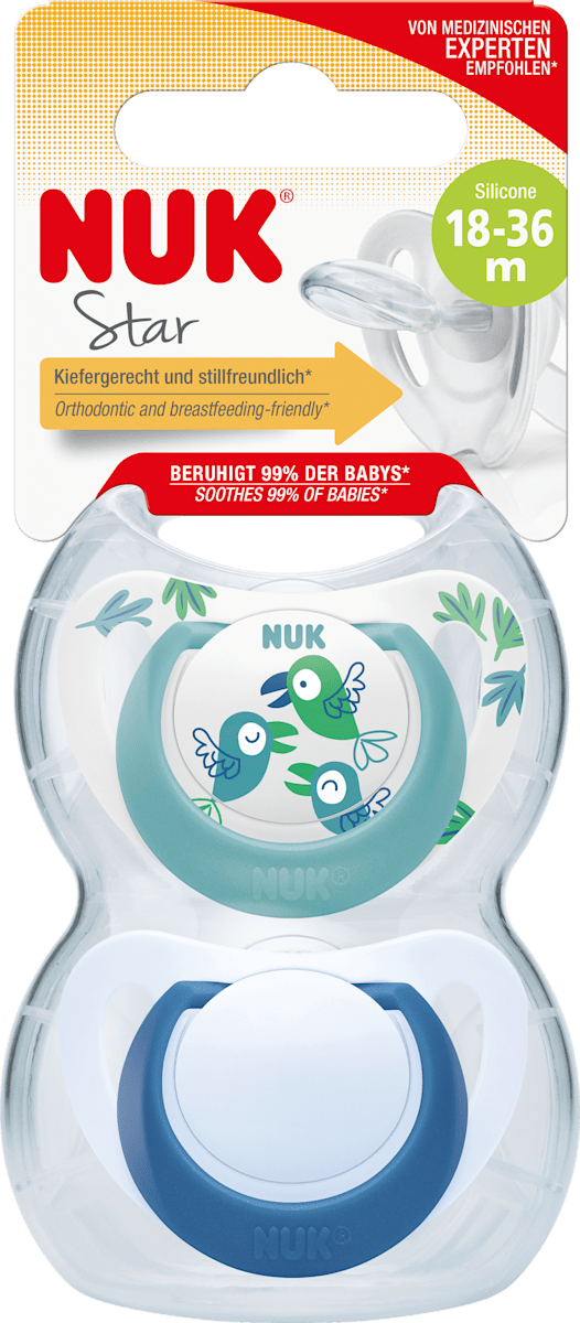 Diese NUK Signature Schnuller in Größe 3 sind perfekt für Kleinkinder von 18-36 Monaten! Im praktischen 2er Pack hast du immer Ersatz parat. Das kiefergerechte Lutschteil unterstützt die gesunde Entwicklung von Kiefer und Zähnen. Der dünnere Saugerhals reduziert den Druck, während das herzförmige Mundschild mit modischem Ring für bequemes Greifen sorgt. Weiche, fließende Formen für maximalen Komfort. Von Mapa GmbH, dem Experten für Babyprodukte. Achtung: Unter Aufsicht verwenden! Perfekt für die Übergangszeit vom Baby- zum Kleinkindalter - weich, sicher und entwicklungsfördernd.