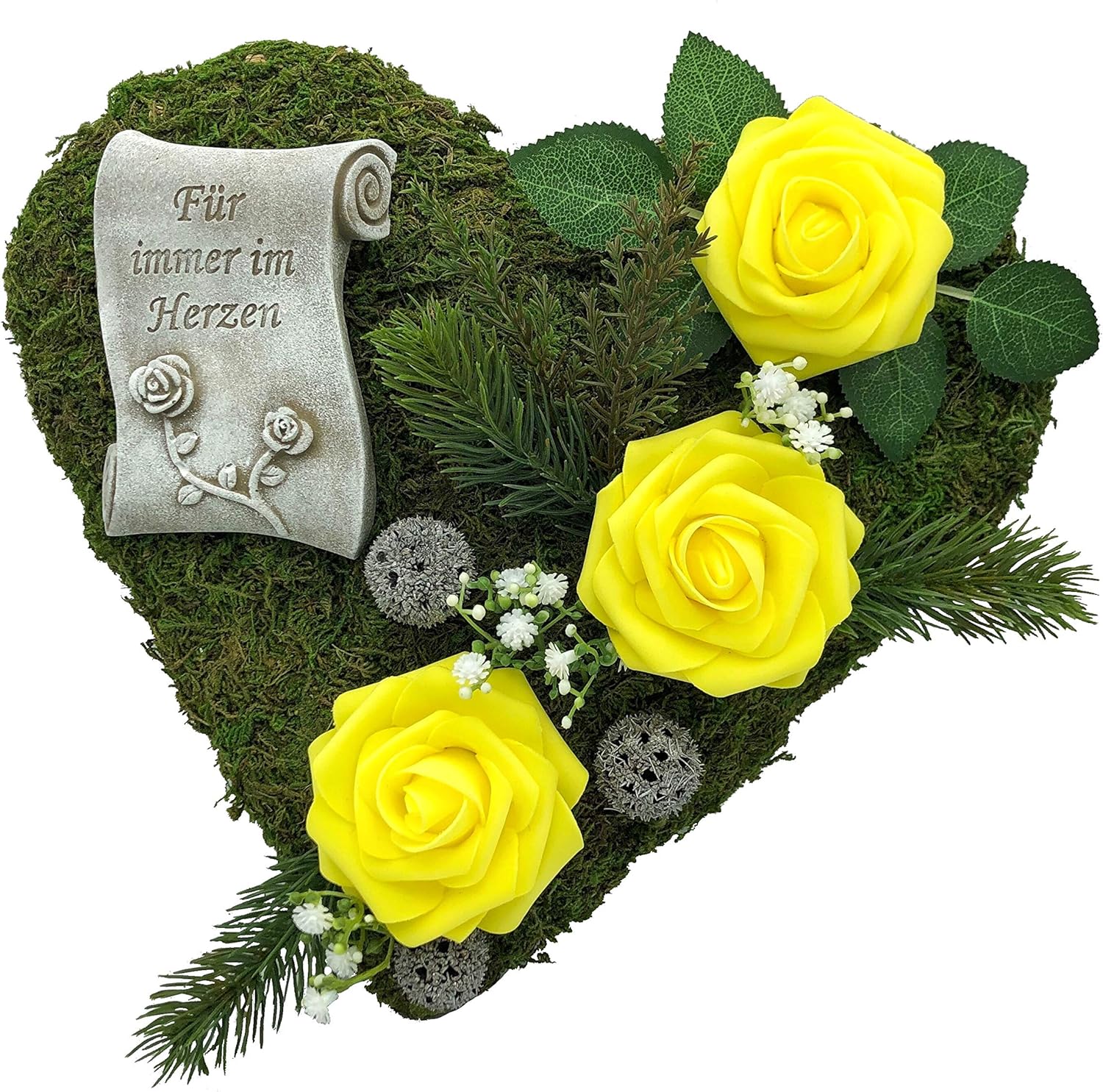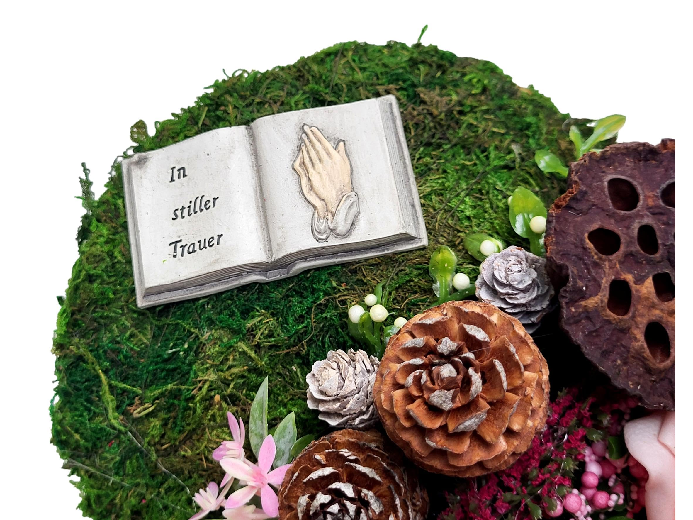 Oh, dieses Grabgesteck ist wirklich etwas Besonderes! Ein wunderschönes Moosherz in 30x30cm, verziert mit tiefroten Rosen und einer kleinen Bibel mit der berührenden Aufschrift 'In stiller Trauer'. Jedes Stück wird liebevoll in Deutschland von Hand gefertigt - dadurch ist jedes Gesteck ein echtes Unikat. Die Rosen sehen täuschend echt aus und das Moosherz ist aus natürlichem, haltbar gemachtem Material. Perfekt für kleinere Gräber oder als letzter Gruß bei der Beerdigung. Das Beste: Es ist komplett wetterfest und braucht keine Pflege - einfach hinstellen und es bleibt lange schön. Eine würdevolle Art, an liebe Verstorbene zu erinnern und das Grab zu schmücken. Die Bibel ist aus wetterfestem Steinguss und handbemalt - einfach wunderschön!