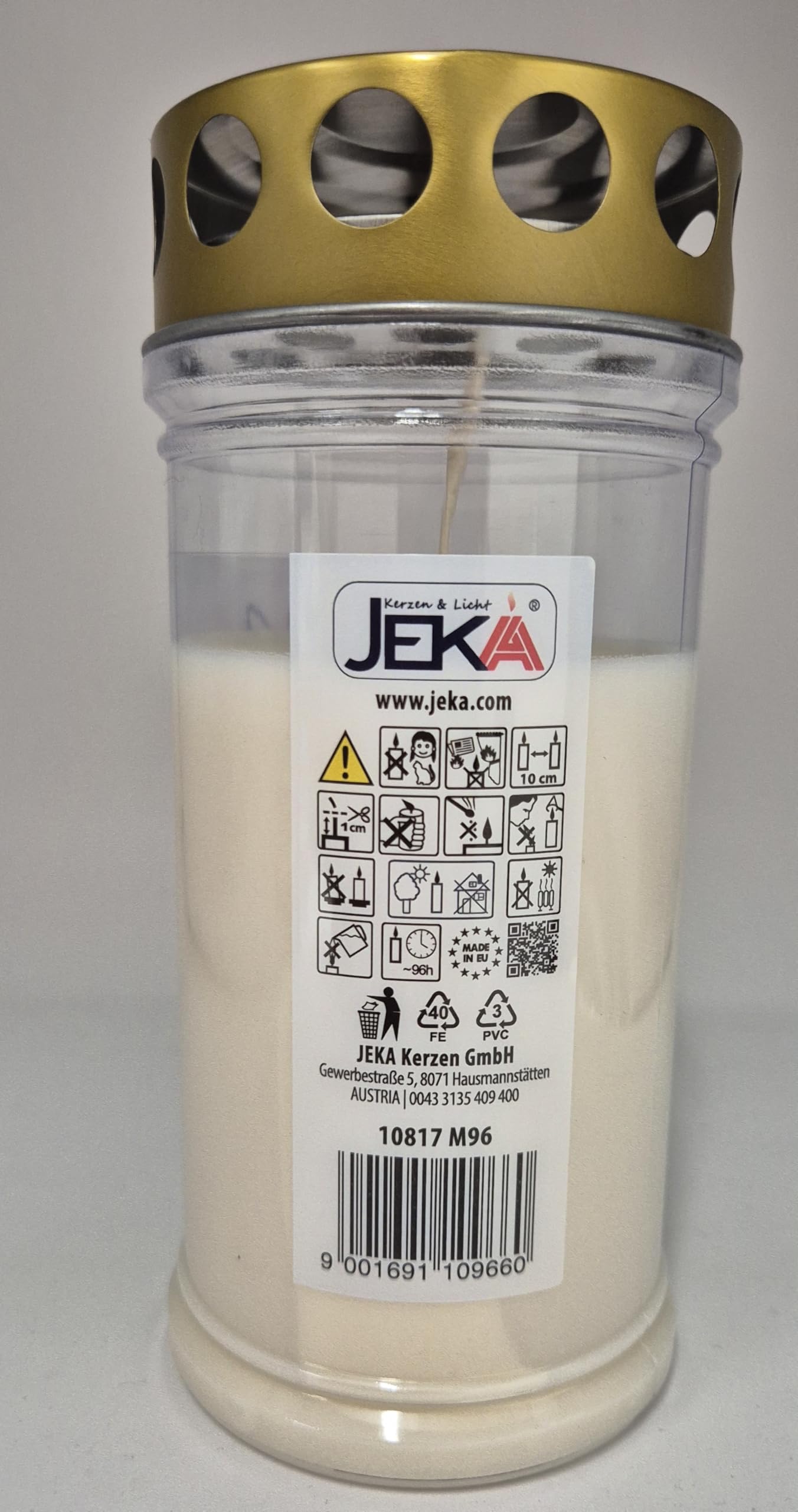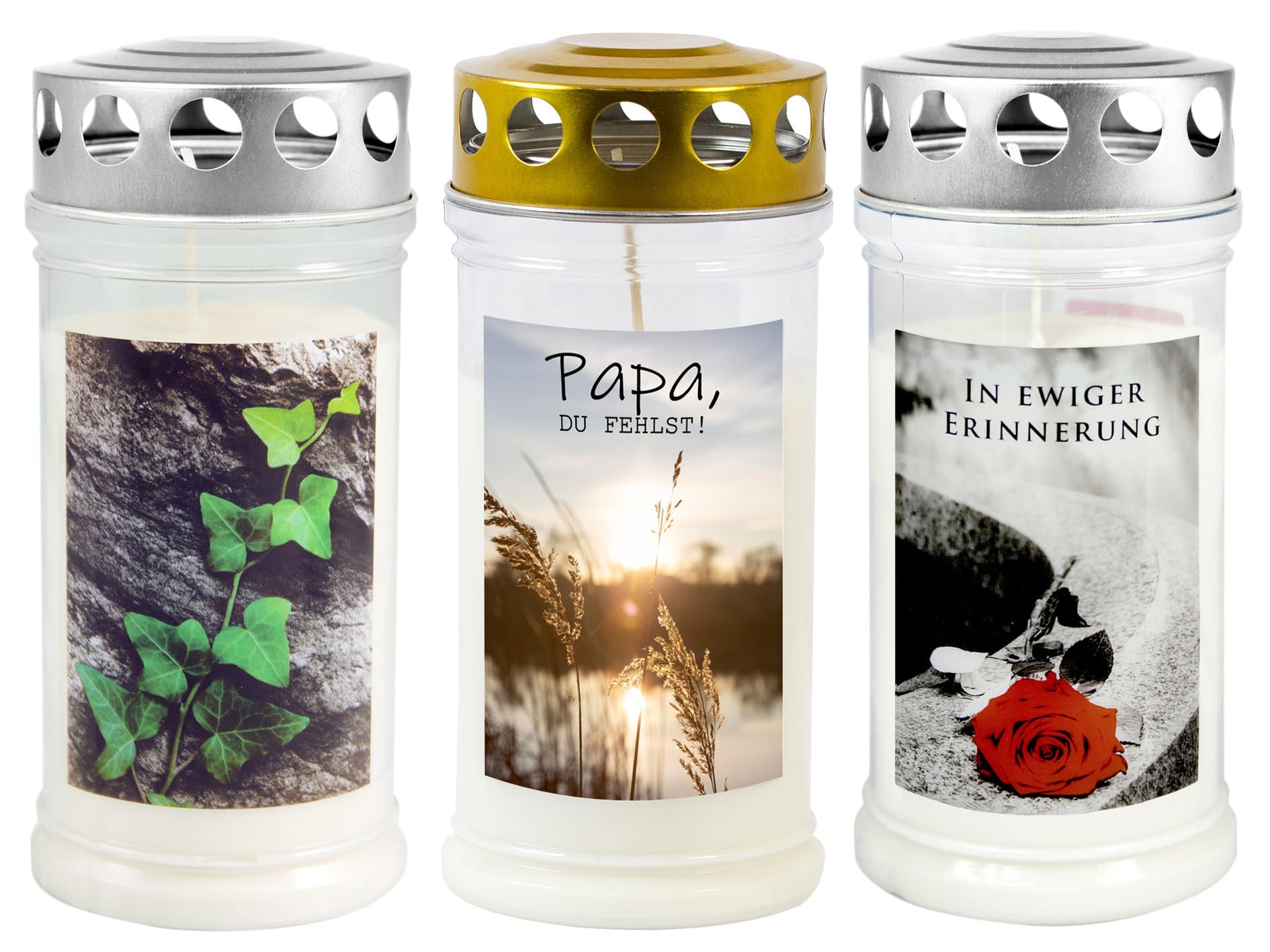 Eine würdige Art zu gedenken. Diese Grabkerze mit der berührenden Aufschrift 'Du fehlst uns sehr!' brennt bis zu 90 Stunden lang - das sind fast 4 Tage ununterbrochenes Licht. Aus 100% Pflanzenöl, umweltfreundlich und mit Baumwolldocht für saubere Verbrennung. Der goldene Deckel schützt die Flamme vor Wind und Regen, sodass sie auch bei schlechtem Wetter zuverlässig brennt. 17 cm hoch, 7,5 cm Durchmesser - die perfekte Größe für jede Grabstelle. Selbst bei Kälte oder Wind bleibt das Licht stabil. Ein tröstliches Zeichen der Erinnerung, das lange hält und hochwertig verarbeitet ist. Einfach anzuzünden und in stillem Gedenken zu lassen.