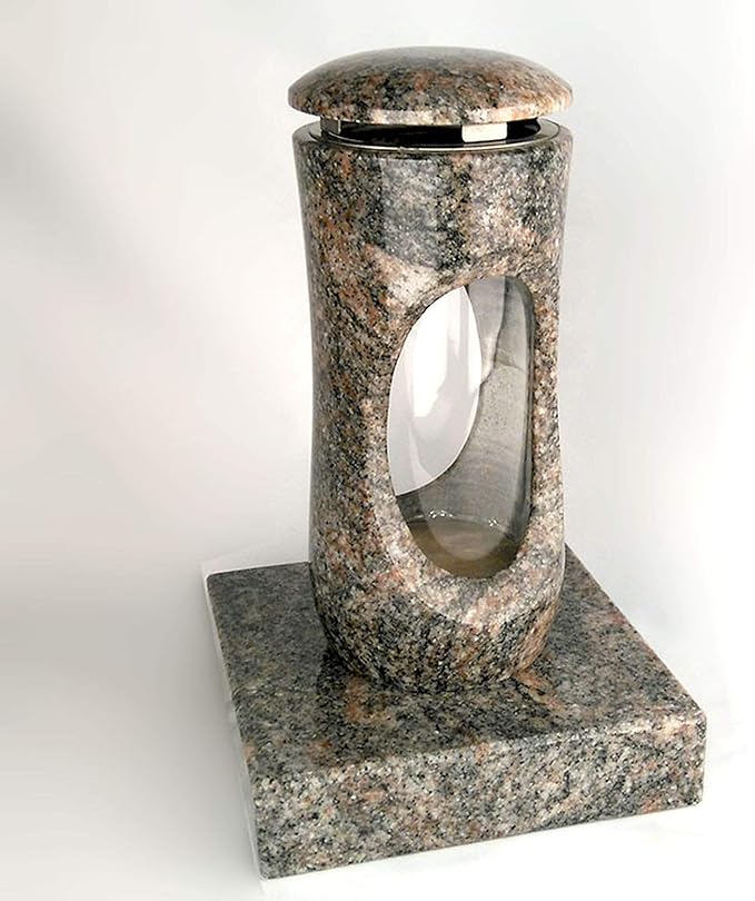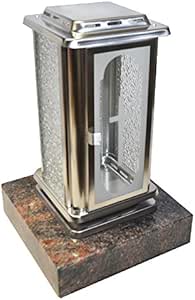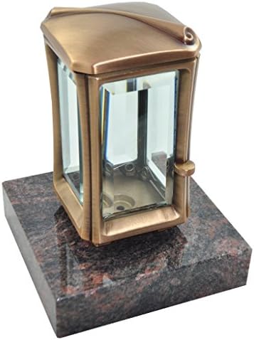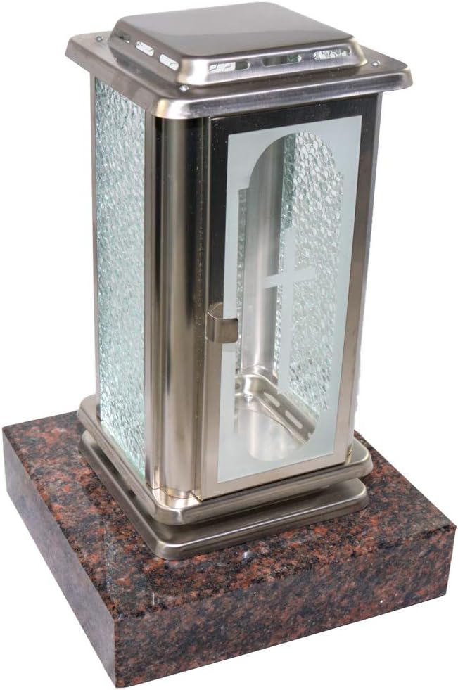 Diese wunderschöne Grablaterne aus Messing ist ein echter Blickfang. Auf einem polierten Granitsockel aus Himalaya-Stein montiert - muss nicht festgeschraubt werden. Mit 23cm Gesamthöhe (Laterne 19cm Breite) und austauschbaren Facettenglasscheiben. Ideal für 1-3 Tages Grabkerzen oder LED-Lichter. Eine Grabkerze von Aeterna liegt bereits bei. Die Tür lässt sich leicht anheben zum Öffnen. Mit Speziallack geschützt - behält lange ihr schönes Aussehen. Wichtig: Nur Kerzen aus reinem Pflanzenöl verwenden, um Verfärbungen zu vermeiden. Eine würdige Dekoration für die letzte Ruhestätte.