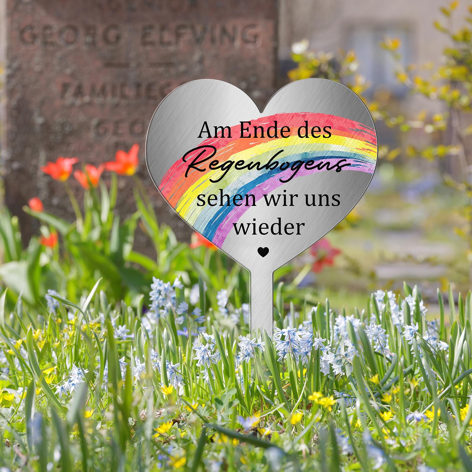 Dieser Herz-Grabstecker ist eine wunderschöne Art, an liebe Verstorbene zu erinnern. Aus robustem Metall, wetterfest und frostbeständig - hält also auch bei schlechtem Wetter. Mit dem berührenden Spruch 'Am Ende des Regenbogens sehen wir uns wieder'. Einfach in die Erde stecken - keine komplizierte Montage nötig. Mit 28x12 cm die perfekte Größe für jedes Grab. Ob auf dem Friedhof, im Garten oder für ein Tiergrab - dieser Grabstecker spendet Trost und ist eine bleibende Erinnerung. Ein stilvolles und langlebiges Andenken das deine Gefühle ausdrückt.