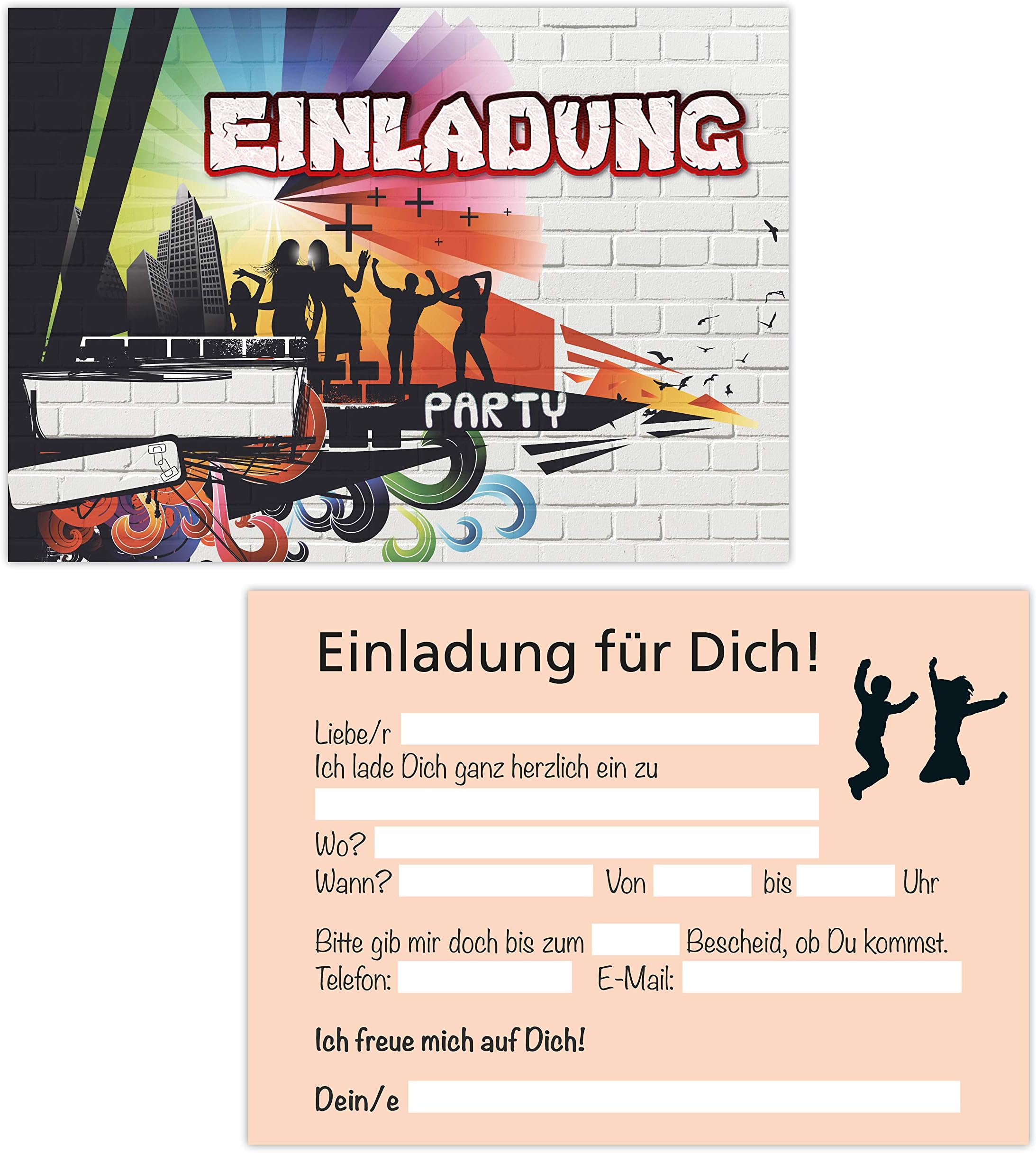 Mach deine Kindergeburtstags-Party zum absoluten Highlight mit diesen coolen Graffiti-Einladungskarten! 15 bunte Karten im praktischen Postkartenformat (14x10cm) warten darauf, beschrieben zu werden. Mit vorgefertigten Feldern für alle wichtigen Infos - einfach Name, Datum, Uhrzeit und Ort eintragen. Das coole Graffiti-Design mit partiellem Hochglanzlack begeistert Jungs und Mädchen gleichermaßen. Super einfach in der Schule oder im Freundeskreis zu verteilen. Ob Motto-Party, Gartenfest oder Jugendfeier - diese Einladungen sorgen für Vorfreude! Aus strapazierfähigem Papier, beschreibbar mit allen gängigen Stiften. Deine Gäste werden begeistert sein!