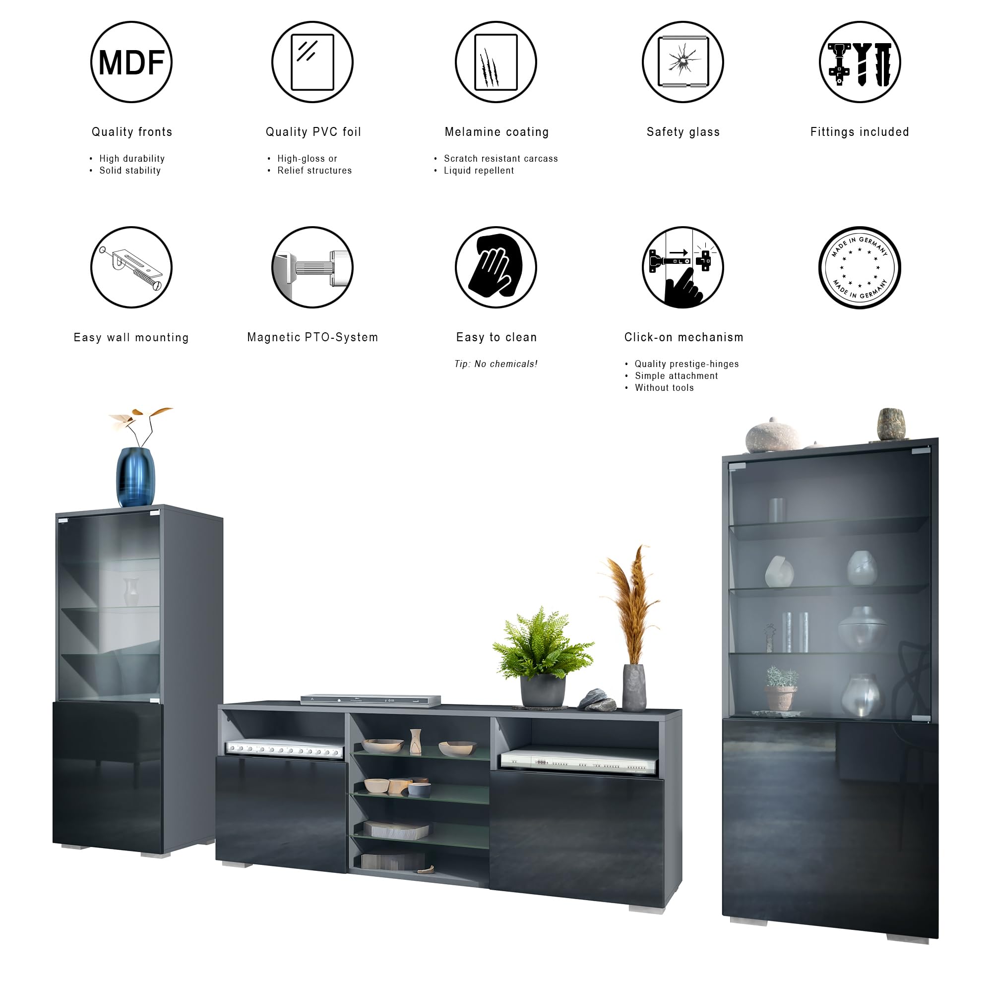 Moderne Eleganz für dein Wohnzimmer! Die Vladon Granada Wohnwand kombiniert zwei schicke Vitrinen mit einem praktischen TV-Board zu einem harmonischen Gesamtbild. Mit den Maßen 286 x 122,5 x 35 cm bietet sie reichlich Stauraum und wird zum absoluten Blickfang. Die Vitrinen mit je einer Glastür und einer MDF-Tür zeigen deine Lieblingsstücke perfekt in Szene, während das Lowboard mit 6 offenen und 2 geschlossenen Fächern Platz für Technik und Accessoires bietet. Die Push-to-Open-Funktion macht das Öffnen kinderleicht, und die wählbaren Farbkombinationen passen zu jedem Einrichtungsstil. Hergestellt in Deutschland aus hochwertigen Materialien - folierte MDF-Fronten und Melamin-beschichtete Spanplatten sorgen für Langlebigkeit und pflegeleichte Oberflächen. Einfach montiert verwandelt sich dein Wohnzimmer in eine stylische Wohlfühloase. Perfekt für alle, die Wert auf Qualität und modernes Design legen!