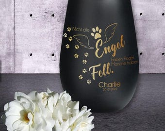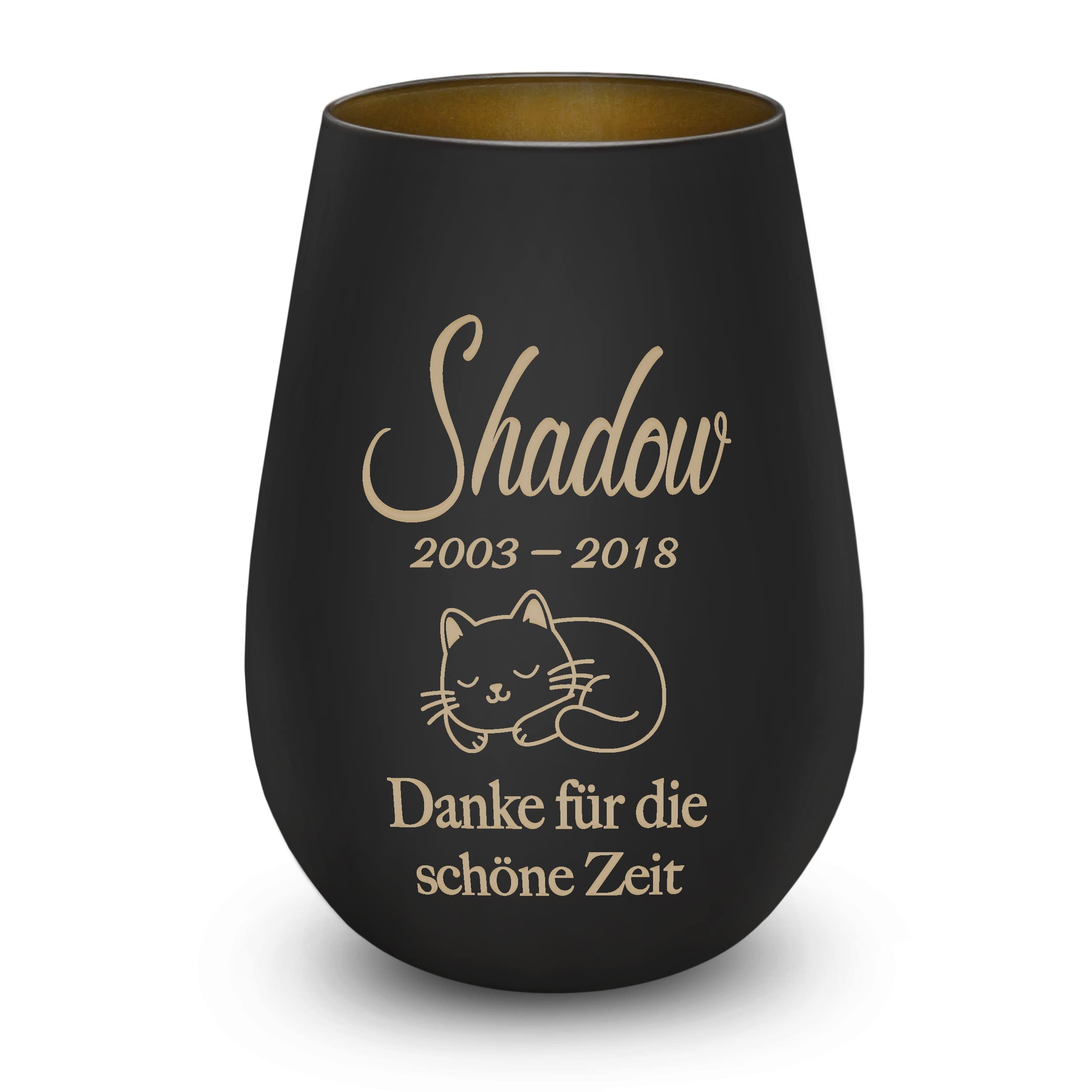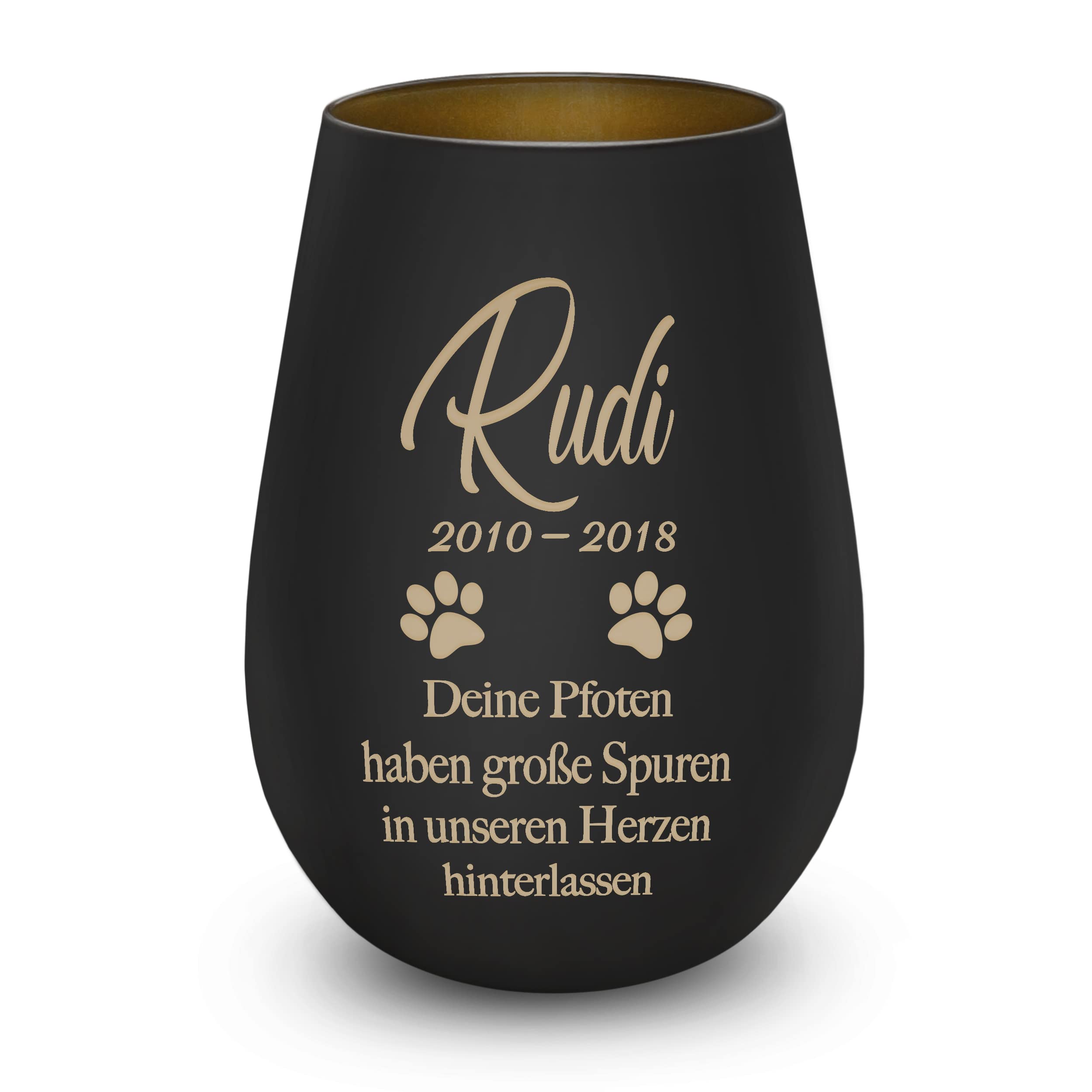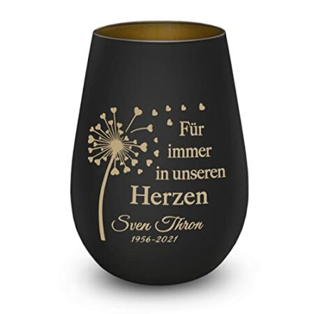 Ein wunderschönes Andenken an deinen treuen Begleiter! Dieses Trauerlicht aus beschichtetem Kristallglas bietet eine würdige Möglichkeit, an deinen verstorbenen Hund zu erinnern. Das Besondere: Du kannst den Namen und ein Datum auf das Glas gravieren lassen - einfach über den Button 'Jetzt anpassen' deinen Wunschtext mitteilen. Sobald ein Teelicht im Glas brennt, scheint das Licht durch die Gravur und schafft eine warme, tröstliche Atmosphäre. Das Windlicht ist 12 cm hoch und hat einen Durchmesser von ca. 8,5 cm. Du hast die Wahl zwischen Schwarz mit goldener Innenseite oder Weiß mit silberner Innenseite. Verschiedene Motive und Gedenktexte stehen zur Auswahl. Ein persönliches und einfühlsames Geschenk für alle, die ihren vierbeinigen Freund verloren haben. Perfekt für die stille Erinnerung zu Hause oder als tröstliches Geschenk für andere Tierbesitzer in traurigen Zeiten.