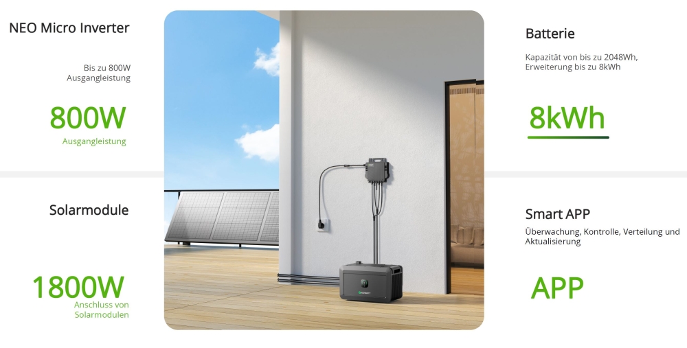 Produziere und speichere deinen eigenen Solarstrom - direkt vom Balkon! Der Growatt NOAH 2000 ist deine persönliche Energiestation für zuhause. Mit 2048Wh Kapazität und der Möglichkeit, bis zu 4 Module zu verbinden (insgesamt 8192Wh!).