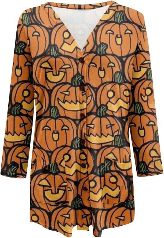 HUIFUO Halloween Strickjacke Damen - Gruseliger Kürbis & Geister Design Übergröße