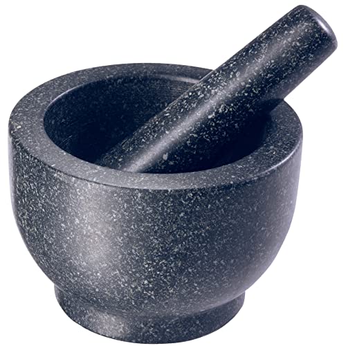 Frische Gewürze machen jedes Gericht viel aromatischer! Mit dem ORION GROUP Gusseisen Mörser bekommst du das ganz einfach hin. Ob du gerade Pestos zubereitest oder Gewürze für dein selbstgemachtes Curry mahlst - dieser Mörser aus robustem Gusseisen ist dein perfekter Küchenhelfer. Die raue Innenseite und die Stößelspitze sind nicht poliert, damit du alles superfein zermahlen kannst. Mit einem Außendurchmesser von 10,5 cm und einer Höhe von 9 cm ist er handlich aber trotzdem groß genug für die meisten Aufgaben. Der Stößel ist 17 cm lang und liegt gut in der Hand. Wichtig: Nach dem Benutzen immer per Hand waschen, gut abtrocknen und ein bisschen einölen, dann rostet er nicht. Nicht für die Spülmaschine geeignet! Für alle, die gerne kochen und würzen - ein absolutes Basic, das in keiner Küche fehlen sollte.