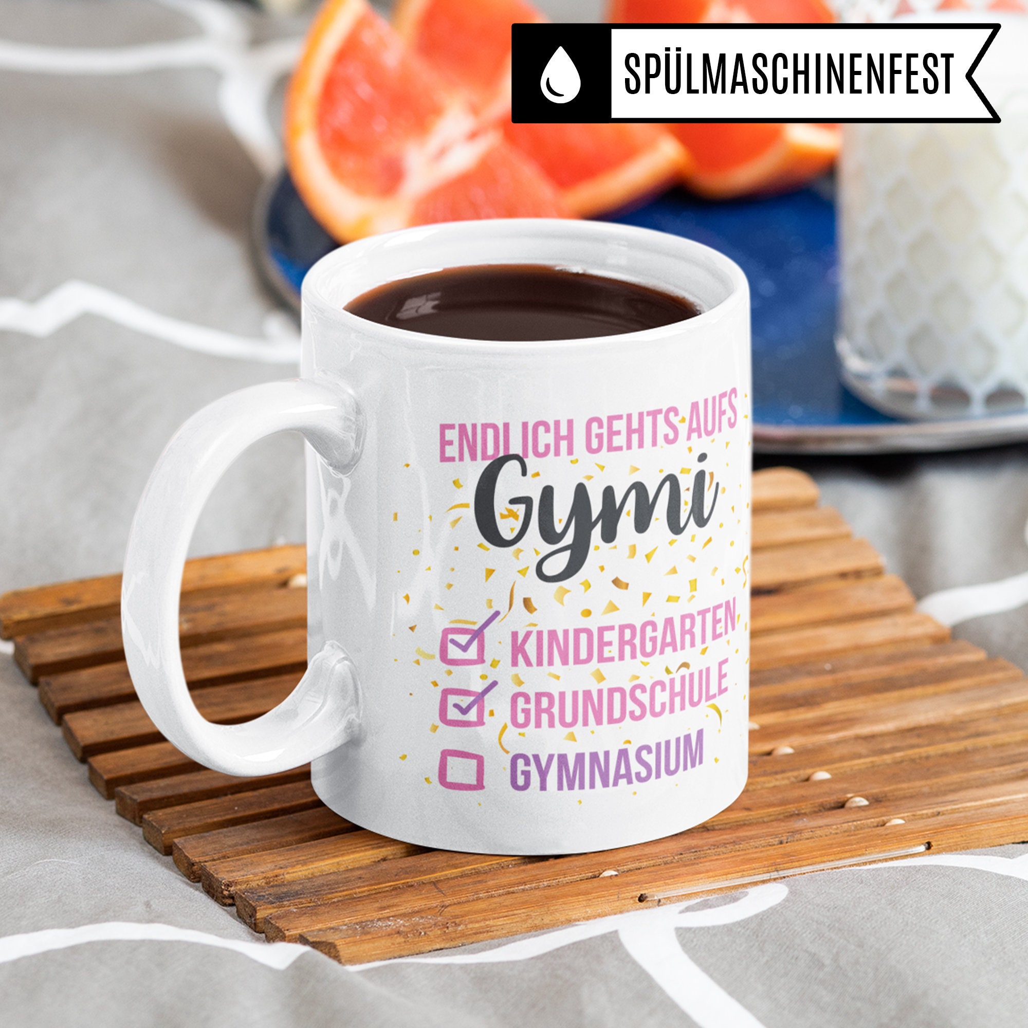 Hey, dein Kind kommt bald ins Gymnasium? Diese personalisierte Tasse ist das perfekte Geschenk zur Einschulung in die 5. Klasse! Mit 330ml Fassungsvermögen ist sie ideal für Kakao, Kaffee oder Tee - oder auch als stylischer Stiftehalter für den Schreibtisch. Das coole Design zaubert garantiert ein Lächeln ins Gesicht und erinnert immer an den großen Schulwechsel von der Grundschule. Die Tasse ist beidseitig bedruckt, also perfekt für Rechts- und Linkshänder. Und das Beste: Sie ist spülmaschinenfest und mikrowellengeeignet! Hergestellt wird sie übrigens in Deutschland mit viel Liebe zum Detail - da passt einfach alles. Ein wirklich persönliches Geschenk, das nicht nur praktisch ist, sondern auch emotionalen Wert hat. Ob zur Einschulung, als Übertrittsgeschenk oder einfach so als Motivation - diese Tasse begleitet dein Kind durch die gesamte Gymnasialzeit und wird garantiert zum Lieblingsbecher!